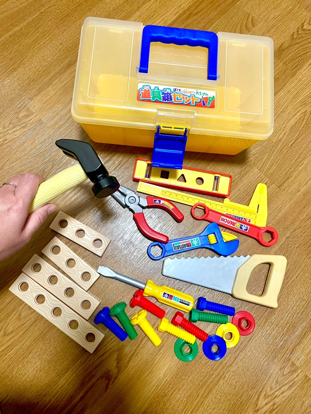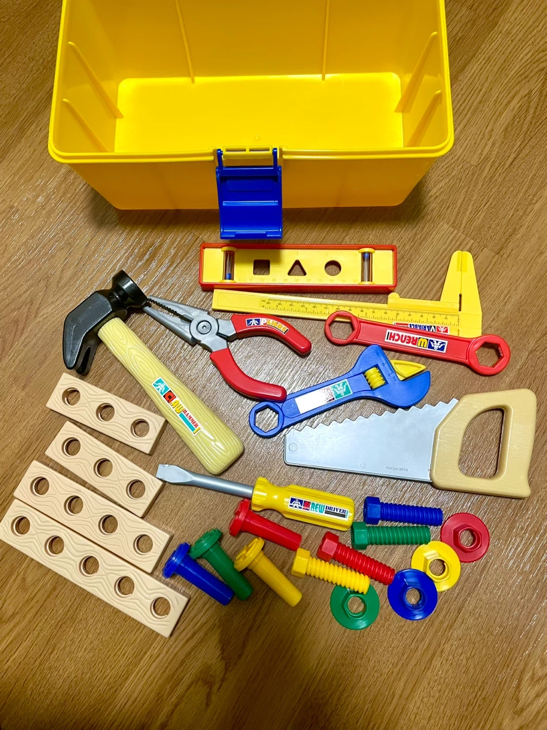 おもちゃの工具セットです。 ・ハンマー、ドライバー、レンチなど様々な種類の工具 ・木製風のパーツ、ネジ、ナット付き ・ケース付き ・使用感少なめ カナヅチでトントンたたいたり ネジをドライバーであけたりしめたり… ナットをレンチであけたりしめたり… いろんな遊びが出来ます 我が家は女の子であまり興味が なかったのか、殆ど遊ばず… とてもきれいな状態です 好きなお子さんは大好きだと思います おもちゃの工具に興味がある お子さんに またお子さん、お孫さんへの プレゼントにいかがでしょうか? 受け渡し場所については 柔軟に対応したいと思いますので プロフィールをご一読ください 他にもたくさん出品しております 合わせてご検討ください 中古品であるということを ご了承の上、ご購入ください ご不明点等ございましたら ご連絡ください