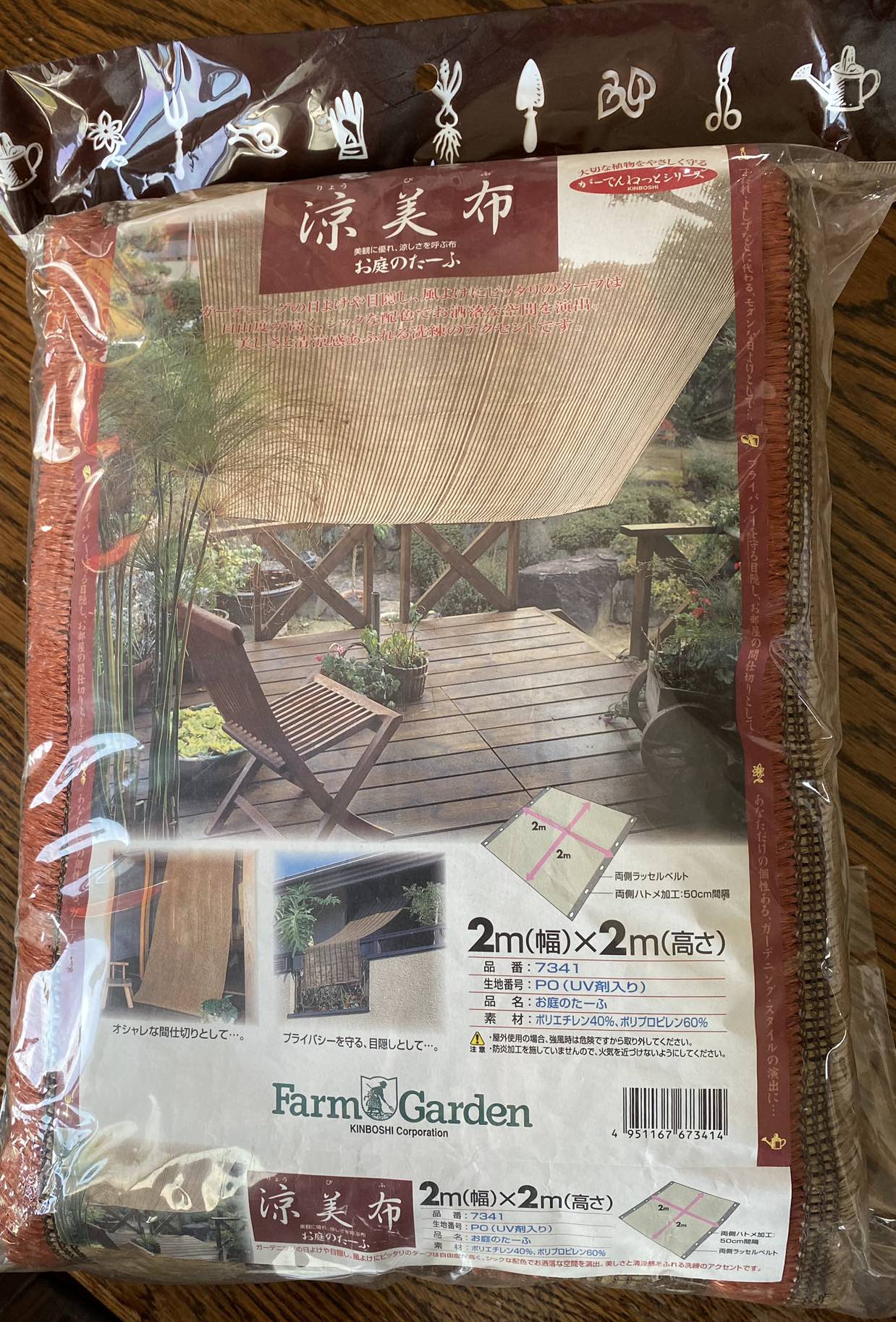 『ガーデニングの日除けや目隠し、風よけにぴったりのターフは自由度が高く、シックな配色でおしゃれな空間を演出。美しさと清涼感あふれる洗練のアクセントです。すだれ・よしずなどに代わる、モダンな日よけとして。プライバシーを守る目隠し、お部屋の間仕切りとして。あなただけの個性あるガーデニングスタイルの演出に。』 数年前に購入したまま、しまってありました。 色味は写真とほぼ同じ感じです。 商品状態:未使用・室内保管 素材:ポリエチレン40%、ポリプロピレン60% サイズ:幅2m×高さ2m