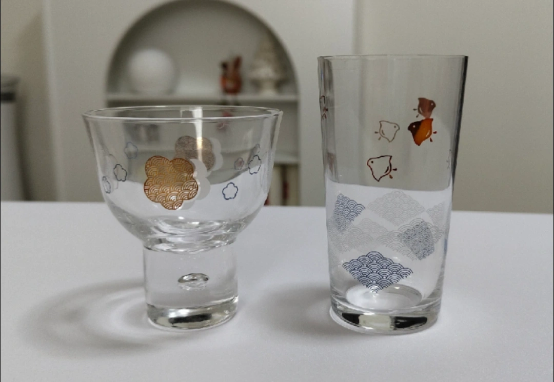 日本酒用のグラス2個セットです 古来から日本で親しまれている吉祥文様あしらった和紋シリーズです。 ・デザイン:花柄と鳥柄 一度使用しました。 左 高さ8cm 直径7.4cm 容量130ml 日本製 右 高さ10cm 直径5.5cm 容量150ml 日本製 ソーダライムガラス 食器洗い乾燥機は使えません。 箱無し 中古品であることご了承ください 新大久保、市ヶ谷、牛込神楽坂 でお渡し可能です。