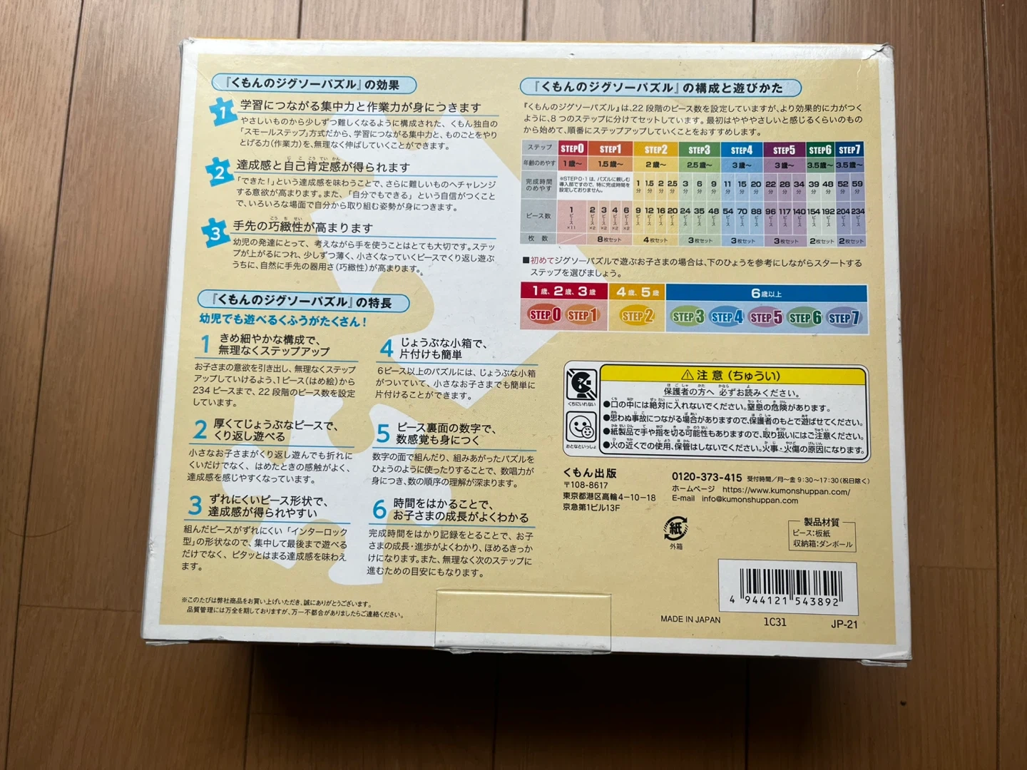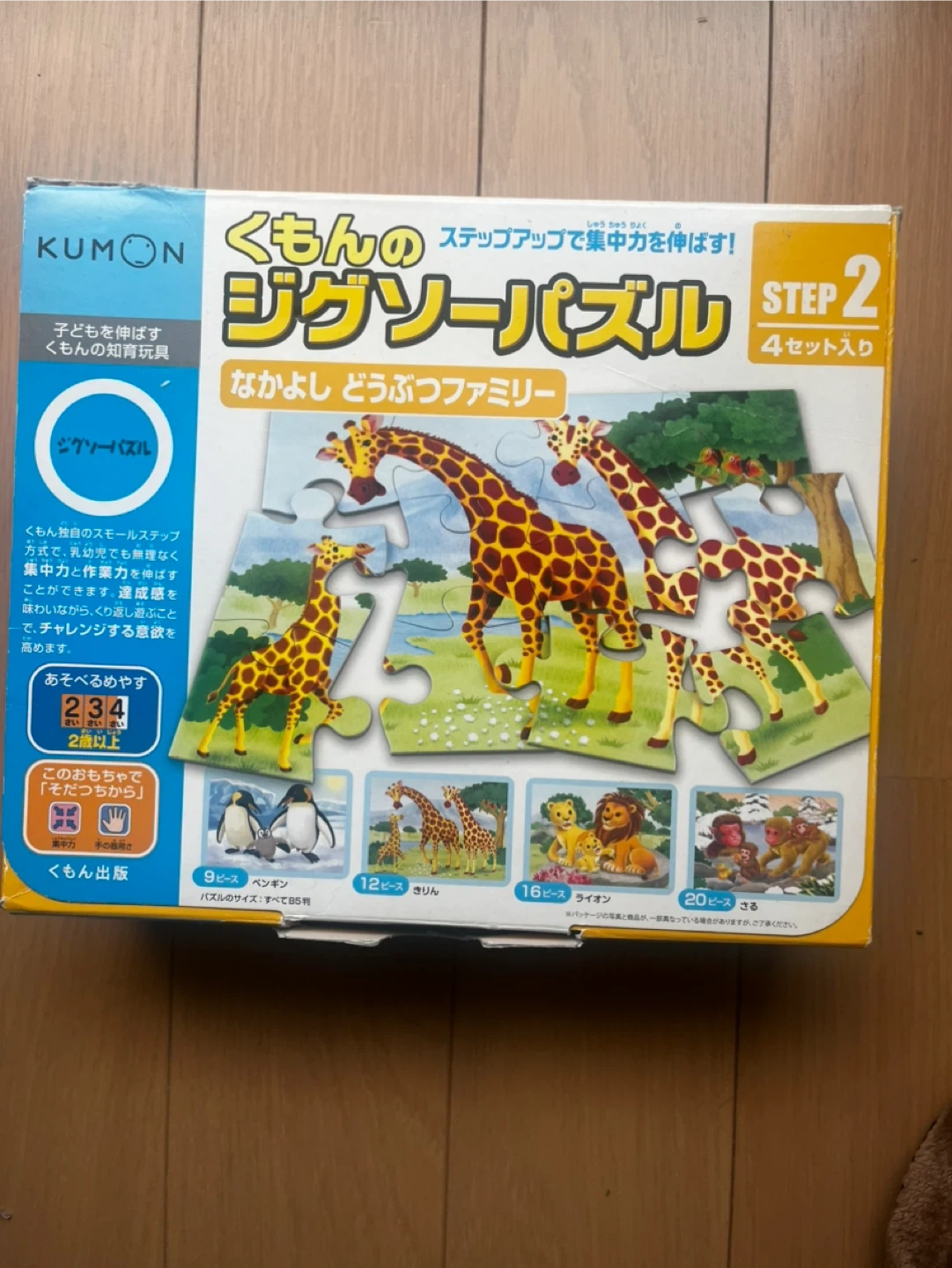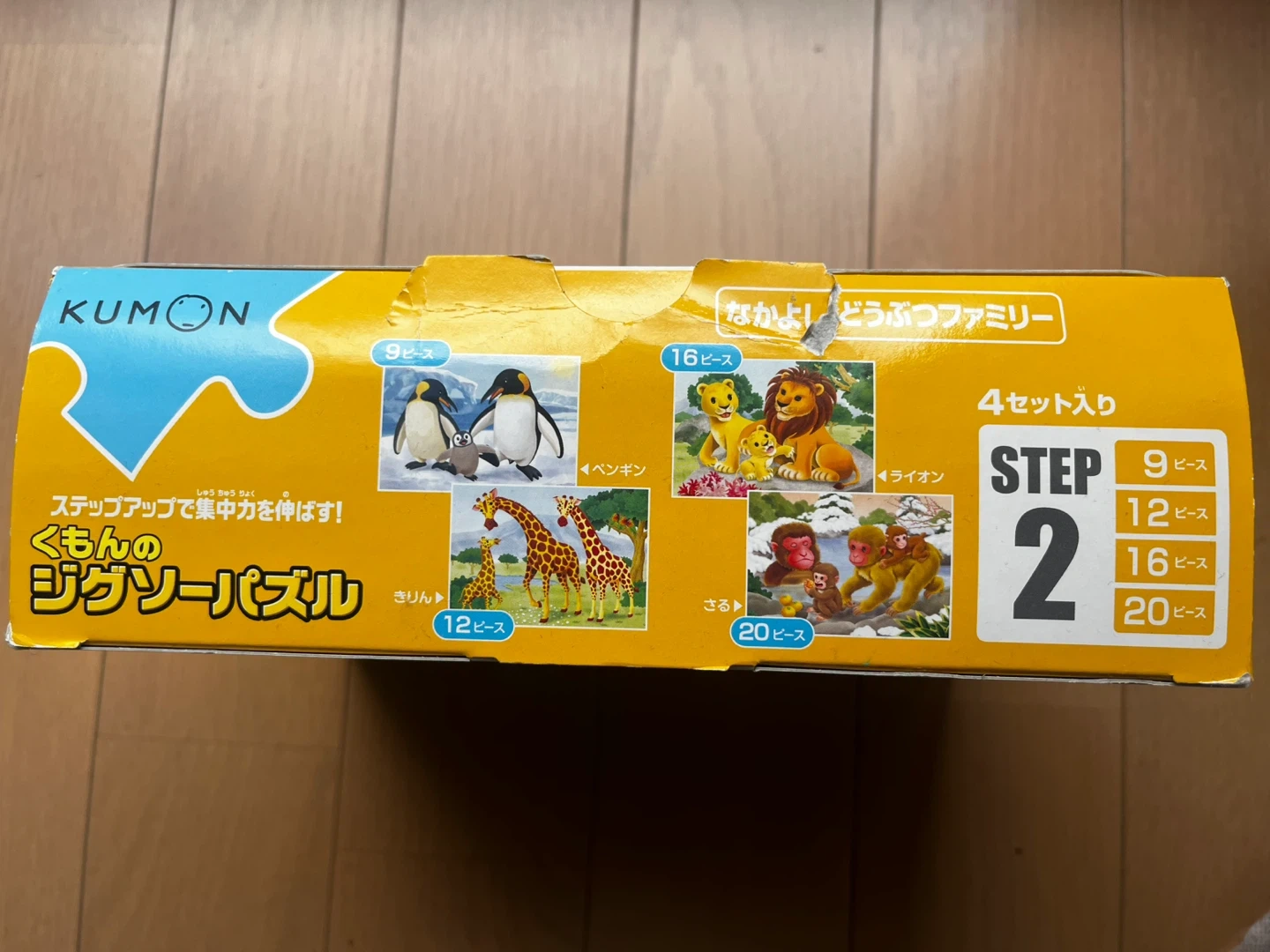 くもんのステップアップジグソーパズルSTEP2の動物編です。 ・内容:4セット入り(9ピース、12ピース、16ピース、20ピース) ・動物ファミリー柄 ・状態:中古品、箱に少しダメージあり 自宅保管の中古品であることをご理解いただき、返品・返金は承っておりませんので予めご了承くださいませ。 ※他の出品物とまとめてご購入いただける場合はお値引きいたします。 ※世田谷区内・近辺であればお近くまでお届けも可能です。ご相談ください。