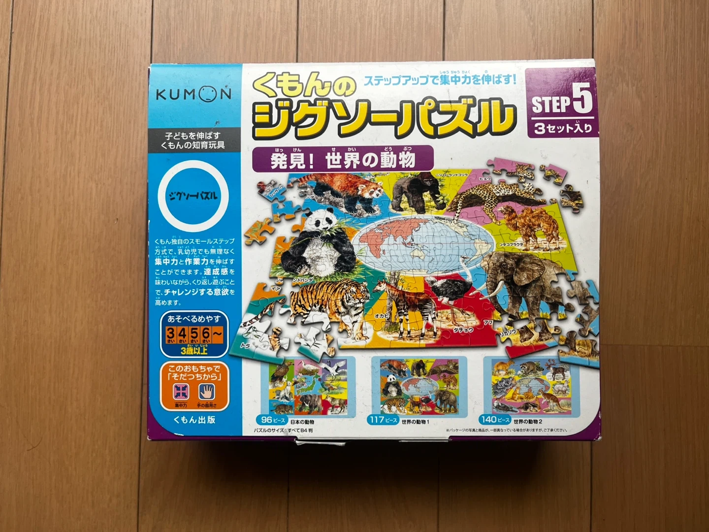 くもんのステップアップジグソーパズルSTEP5の動物編です。 ブランド:くもん KUMON ・種類:ジグソーパズル ・ステップ:5 ・セット内容:96ピース、117ピース、140ピース ・デザイン:世界の動物 自宅保管の中古品であることをご理解いただき、返品・返金は承っておりませんので予めご了承くださいませ。 ※他の出品物とまとめてご購入いただける場合はお値引きいたします。 ※世田谷区内・近辺であればお近くまでお届けも可能です。ご相談ください。