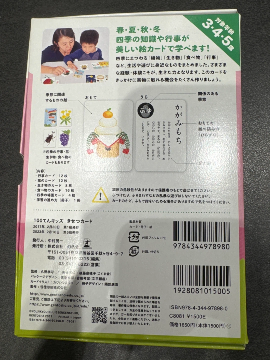 100てんキッズのきせつカードです。 小学校受験用に買いましたが、受験をしないお子さんにも役に立つ商品だなと思います。 ・季節のカード ・絵カードを使って分かりやすく季節を学べます。 ・全パーツ揃っています。   ほぼ未使用なのできれいですが 中古品であることをご了承ください。