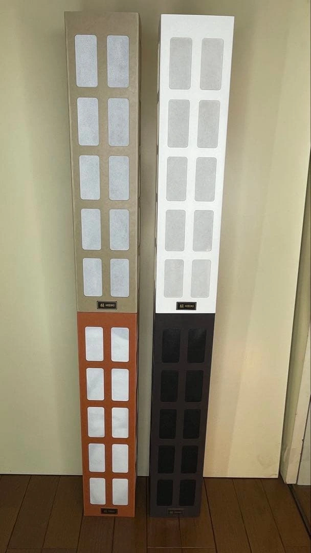 株式会社アスカaska-audio.com 質問歓迎設置場所具体的に提案❗️ 詳しくはHP。 商品は1枚目の写真右から1本目チョコの6本セットです。 マイ電柱氏や500万円分調音材使用の方が僅か2本で腰を抜かした。 オーディオボード、吸音材など試されて効果に満足されない方へ、これで吸音に終止符が打てます。 低音のコモリ定在波を削減し、驚異的な音質改善効果があります。 オーディオメーカーや販売店は効果があるかもと期待させる高価な製品を販売し、売上と利益を上げる事が目的です。 このような安価な調音ボックスで問題が解決してしまっては、商売にはなりません。 したがって、凸凹フワフワした吸音?反射?かわからない商品や、ボードの穴に吸音材が入った商品、繊維系吸音材など、取り敢えず何かを試してみるように勧めます。 そうなればシメタモノ、中高域が減少し定位が悪化するだけで、問題解決するはずが無く、それならと別の商品をススメ、それでも改善されないため、さらに別の商品をススメます。 気がつけば3〜5種の吸音材調音材にまみれた自分がいます。 記録された音を聴きたいのに、中低域を吸音できず、中高域しか吸音しない吸音材を設置すればするほど、布団を被って聞くテレビの音のごとく。 ますますこもったモヤモヤドヨドヨした低域になります。 そうなるとケーブルやアンプを、いやスピーカーを替えないとダメなのかと泥沼に首まで浸かってしまいます。 問題は指向性の弱い中低域の定在波や反響音が、指向性の強い中高域を変調していることであり、これを改善しないと幾ら高価な装置であっても、何百万円の吸音材を用いても、スピーカーから発せられた音に一生近づけません。 肝臓が悪いのに、胃薬を飲んでも、問題は解決しません。 New韻HIBIKI1本辺り36万m2の面積を持つ多孔質の特許吸音材が、低域を吸音することで一気に解決します。12×12×52センチ 約1150g 「コンサート会場を切り取って目の前に持ってきたよう」「ステージの楽器と楽器の間に入っていけるよう」「韻HIBIKIに出会わなかった事を考えるとゾッとする」数千本の販売実績が、貴方の音楽人生を劇的に価値あるものに変える事を約束します。 写真左からレンガ、ベージュ、ホワイト、チョコ各色6本入、4本入170千円もあります。試聴機HPより問合せ。