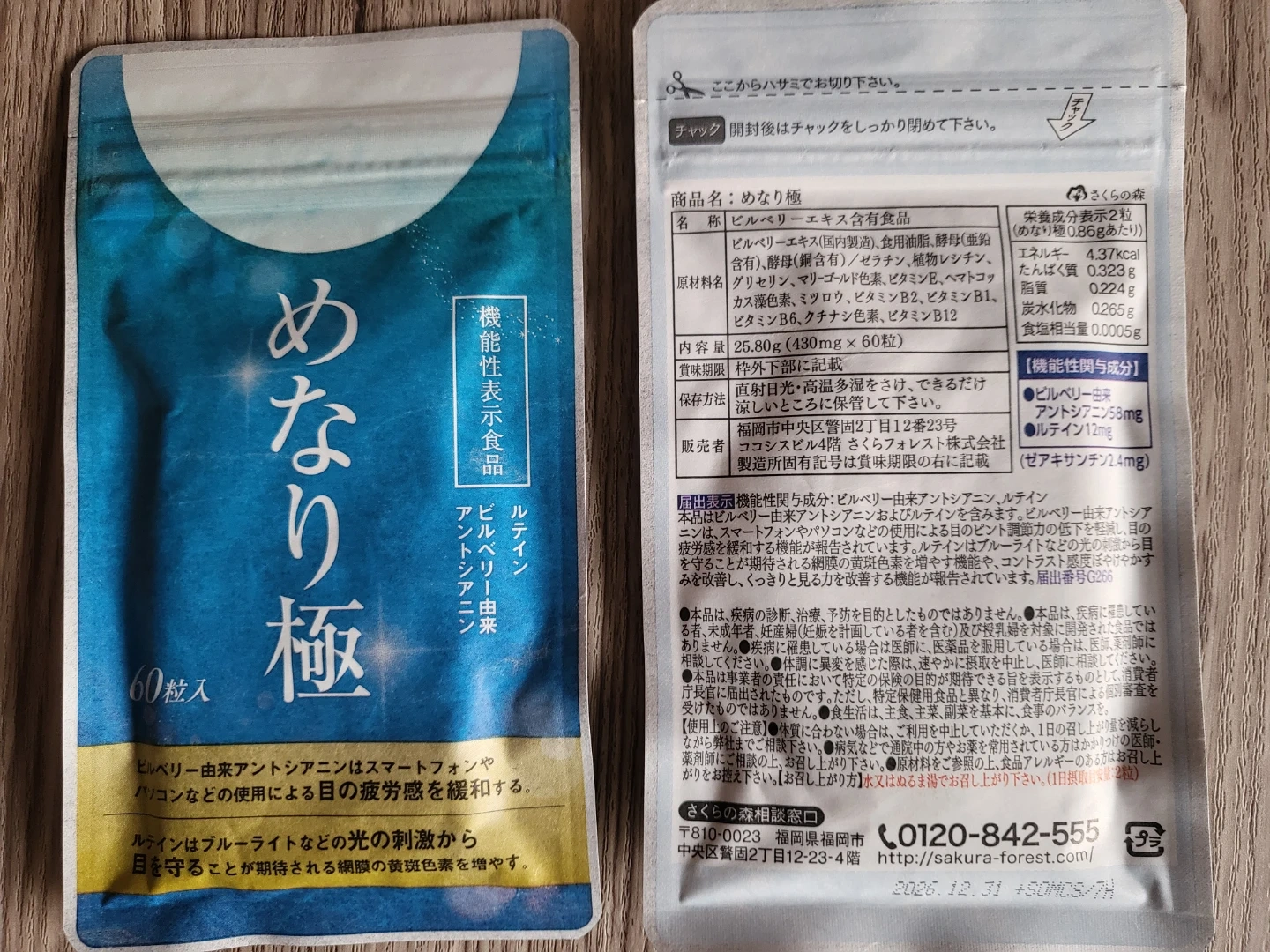 さくらの森のサプリメント「めなり極」です 【情報】 商品名:めなり極 名称:ビルベリーエキス含有食品 内容量:25.80g(430mg×60粒) 機能性関与成分:ビルベリー由来アントシアニン58mg、ルテイン12mg 【状態】 未使用品 自宅保管 【その他】 賞味期限:2026年12月31日