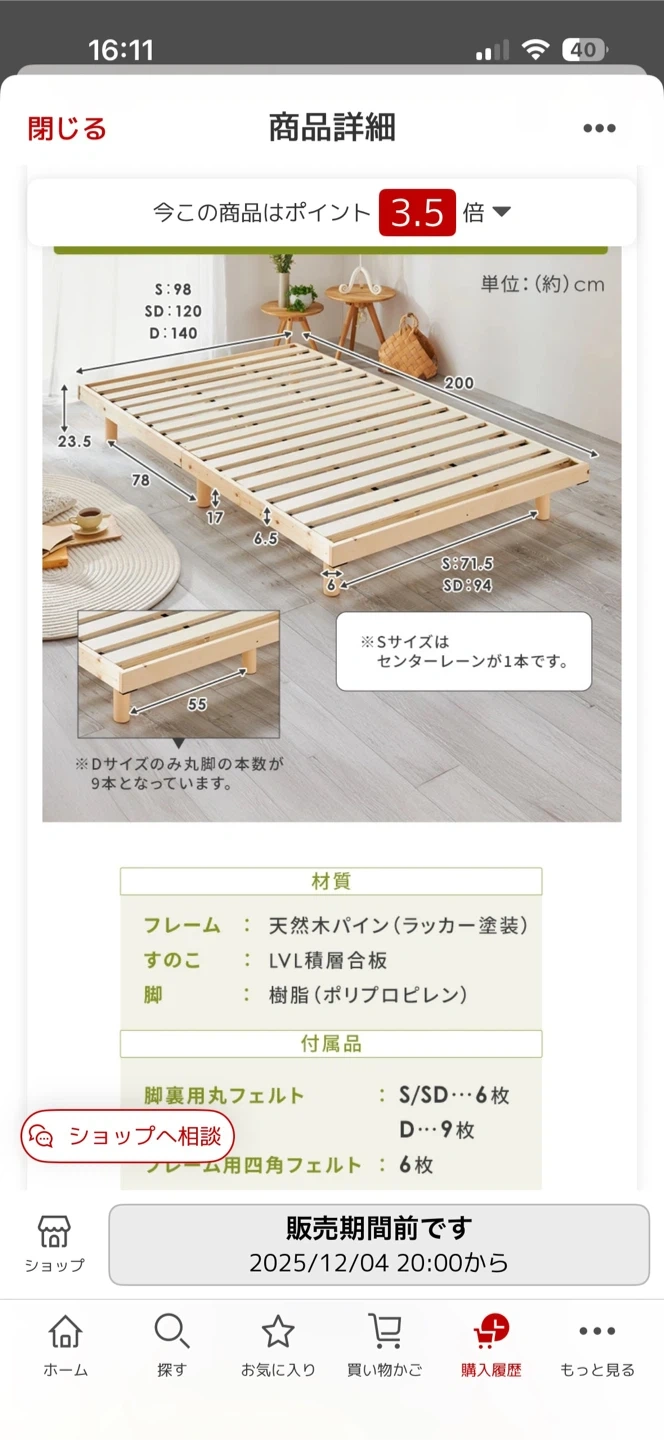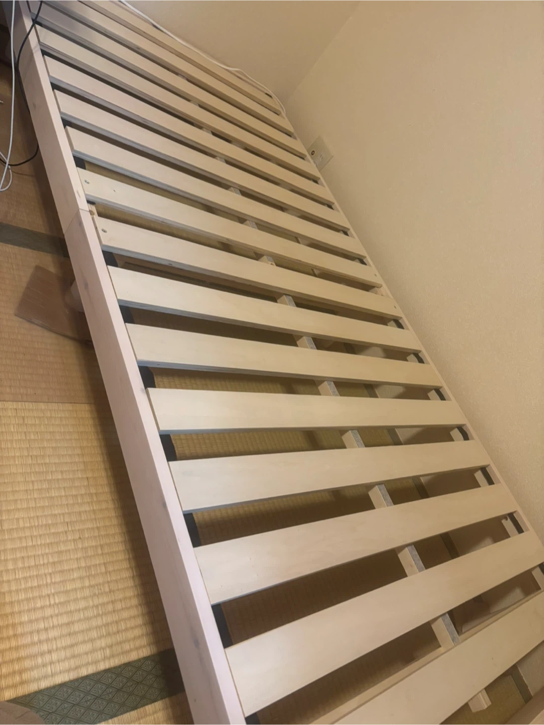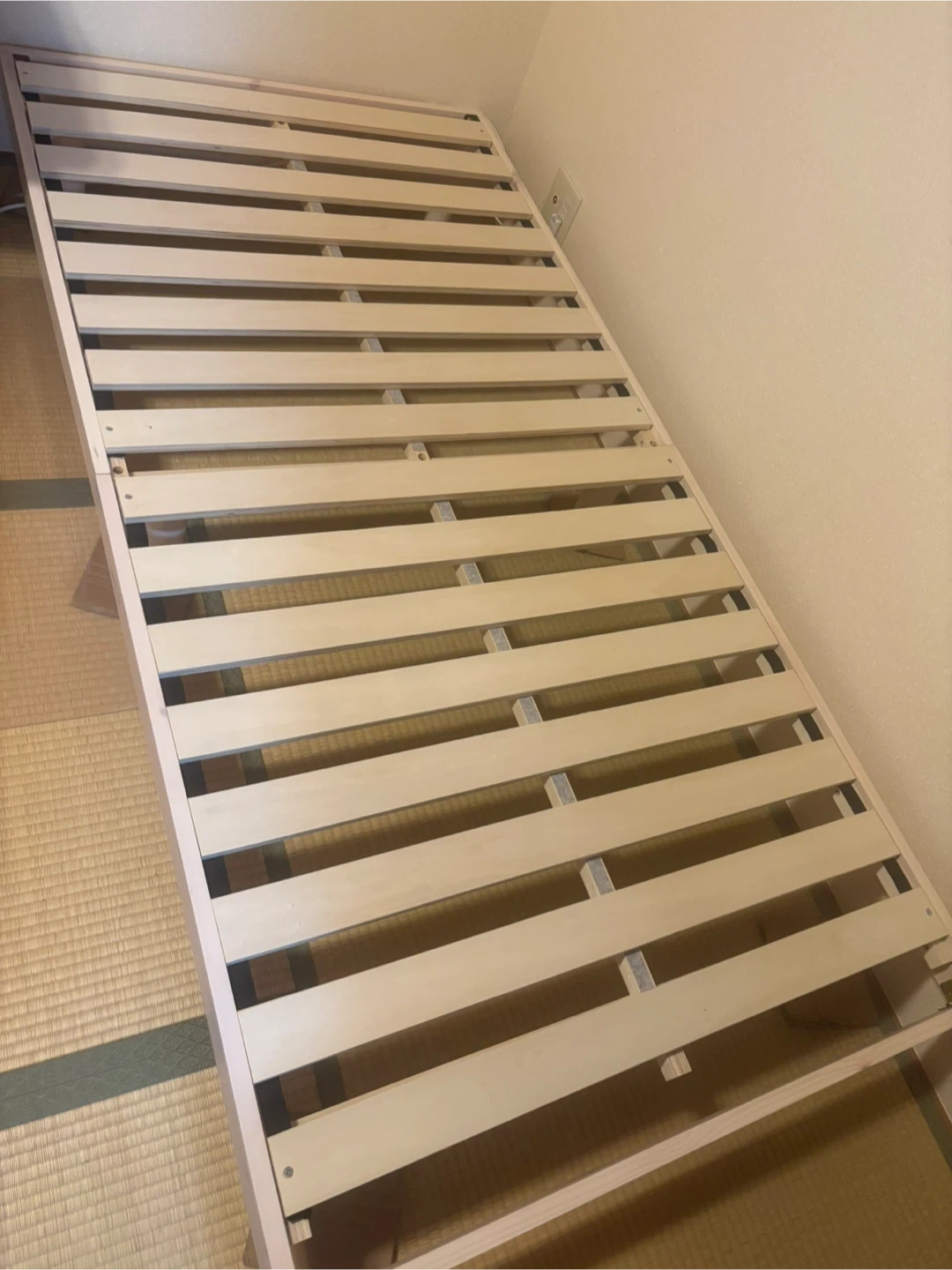 すのこベッドフレームです。 直接引き取りを希望いたします。 【情報】 材質:天然木パイン(ラッカー塗装)、LVL 積層合板、樹脂(ポリプロピレン) 【サイズ】 S:98 x 120 x 23.5cm SD:120 x 140 x 23.5cm 奥行:200cm 脚の高さ:71.5cm(Sサイズ)、94cm(SDサイズ) ※受け取り先住所の詳細につきましては、契約成立後追って連絡します。 中古品であることをご了承ください。
