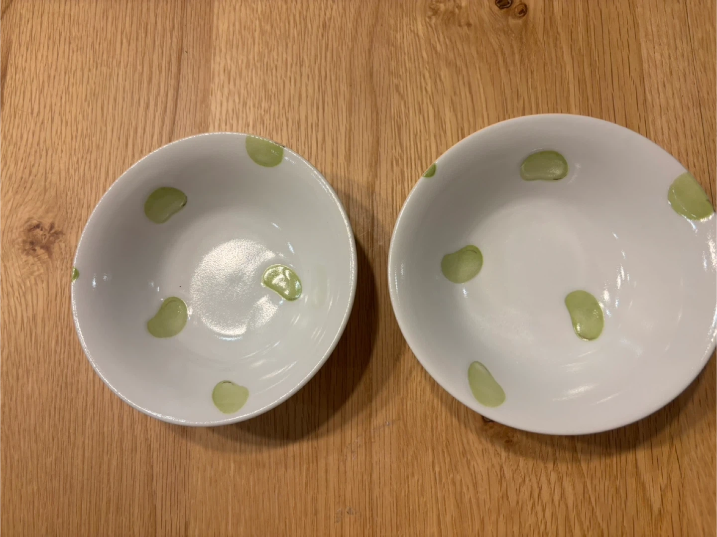たち吉の器2個セットです ・ブランド:たち吉 ・色:白地に緑色の豆柄 ・状態:使用感少なめ ・2個セット ・高さ4.5cm, 直径top14.4cm,内側底8-9cm 使いやすく、何にでも合います✨ とっても気に入っていました! 他のが割れてしまい家族分揃わなくなったので、 欲しい方にお安くお譲りします😊