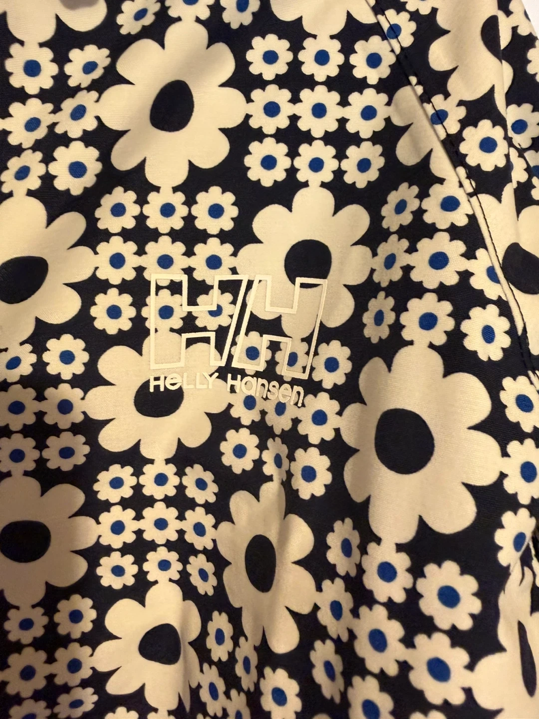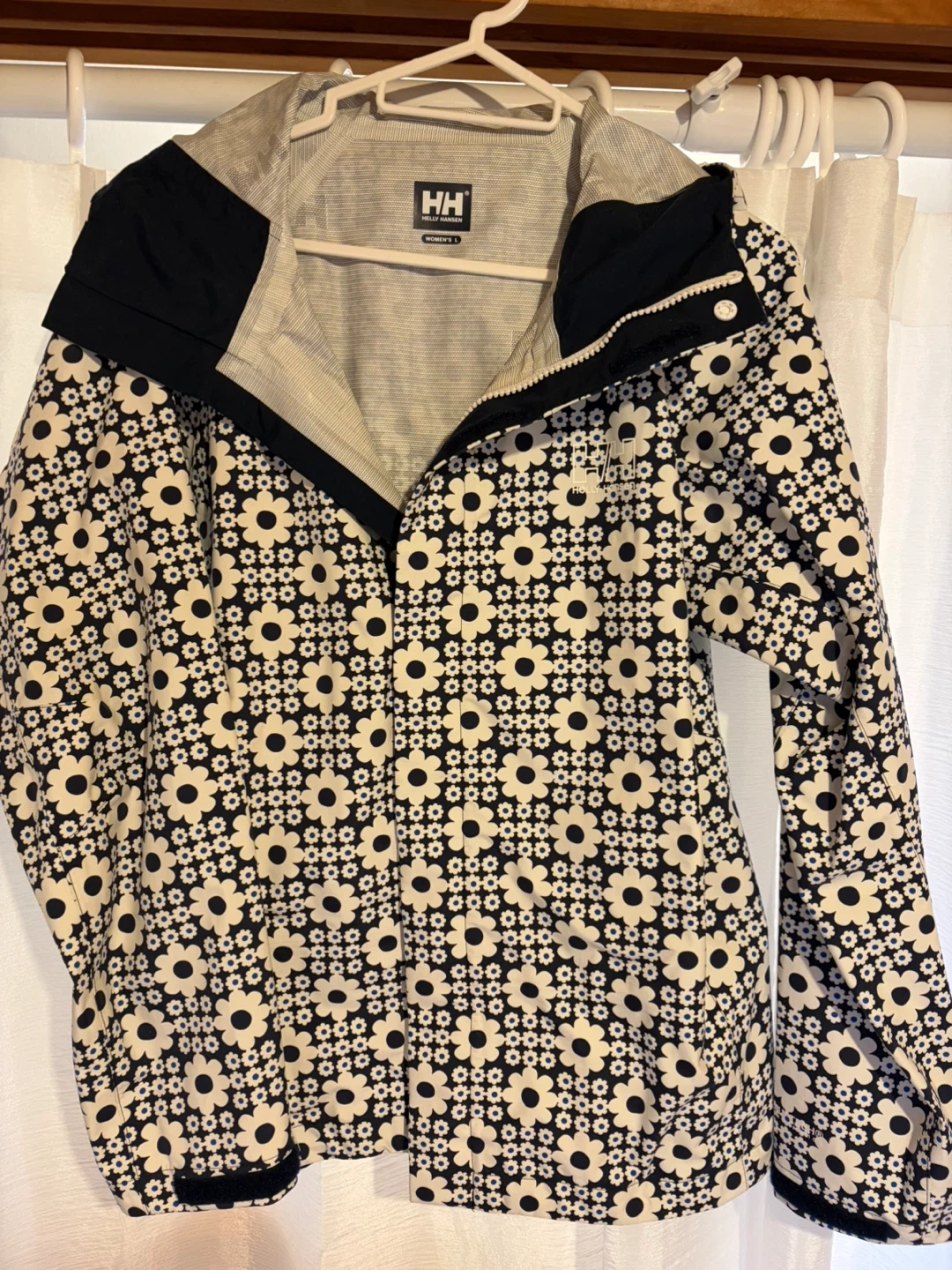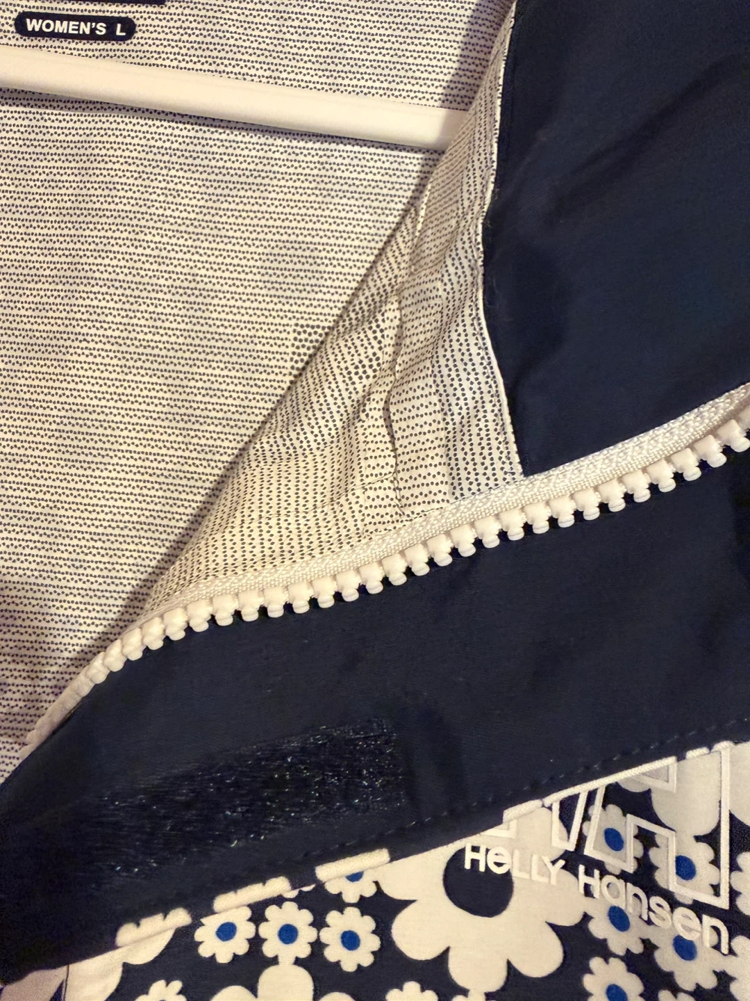 ほぼ新品ヘリーハンセンのジャケットです 【情報】 ブランド:ヘリーハンセン サイズ:L(WOMEN'S L) 柄:花柄 色:白、紺、青 両サイドにポケット付いてます フードも付いてます 前部分は、ファスナーとマジックテープの両方が付いています 1度だけ着用しました とても綺麗な状態です 受け渡し場所 北綾瀬駅、亀有駅
