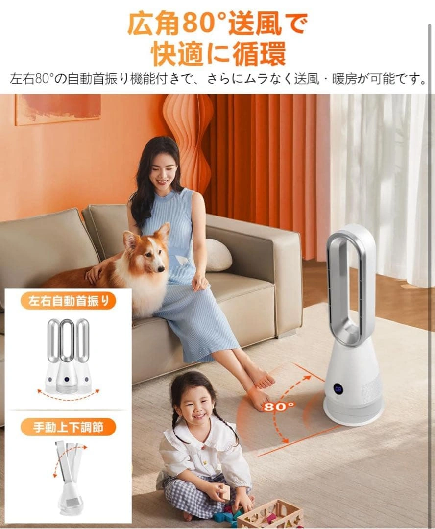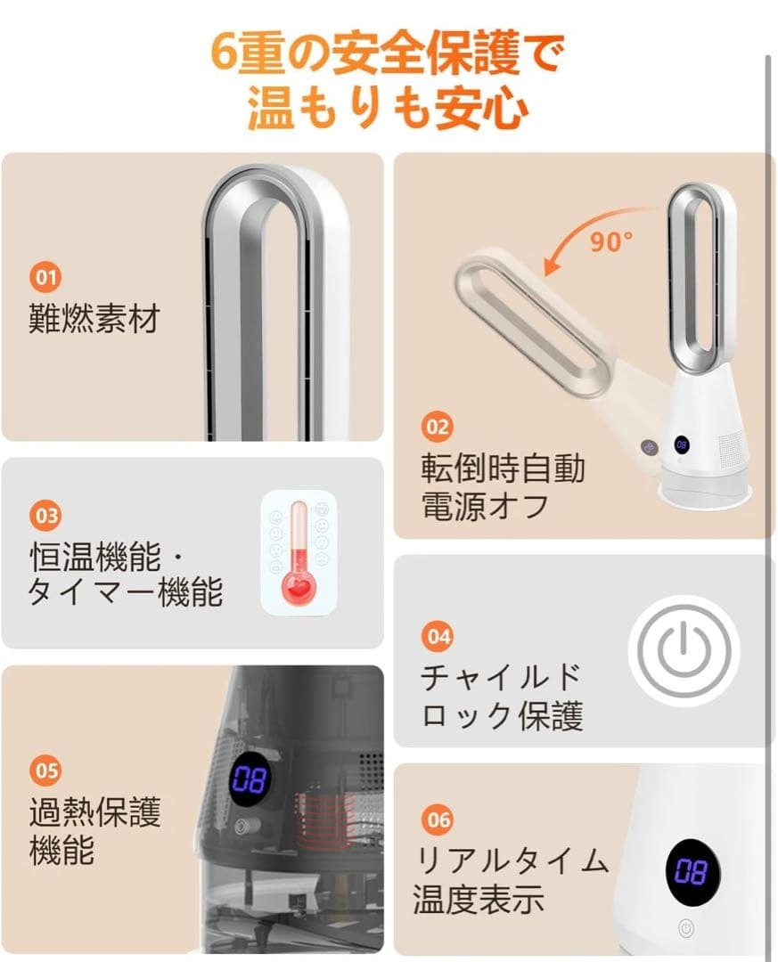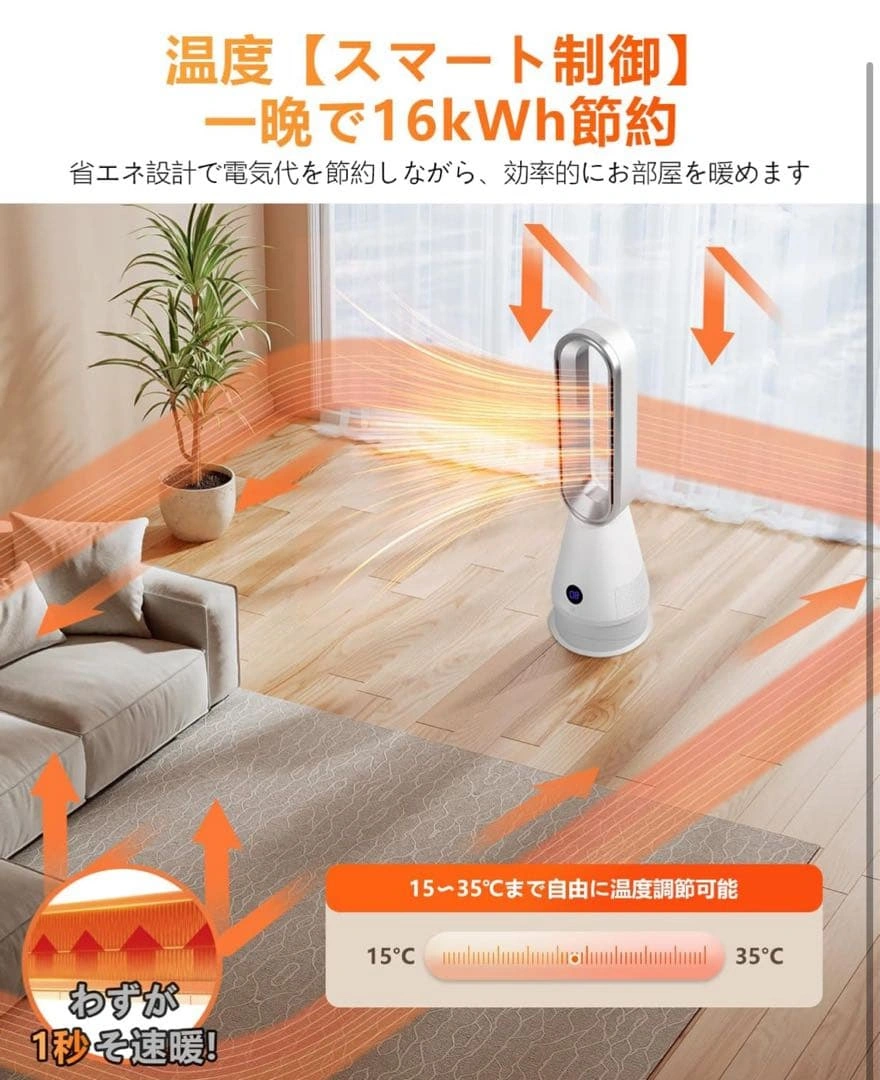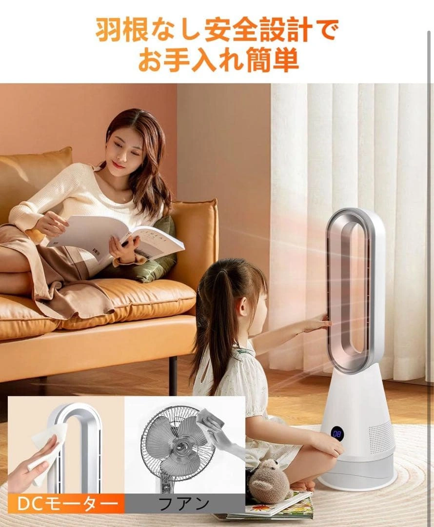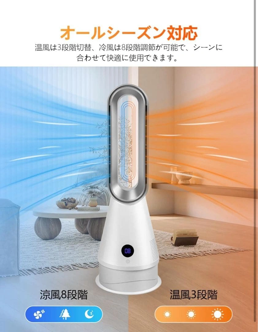 温風と涼風の切替が可能なセラミックファンヒーターです。 - 冷暖房機能: 温風8段階、涼風8段階 - 安全機能: 6重安全保護機能 - リモコン: リモコン付き - 温度表示: リアルタイム温度表示 - デザイン: スタイリッシュなデザイン - 自動 電源オフ: 転倒時自動電源オフ 冷暖兼用で、オールシーズン使用できます。羽根なし設計で、お子様やペットがいる家庭でも安心です。DCモーター採用で省エネ運転が可能です。運転音も静かで、就寝時にも最適です。 ご覧いただきありがとうございます。 ご希望の方はお気軽にご連絡ください。