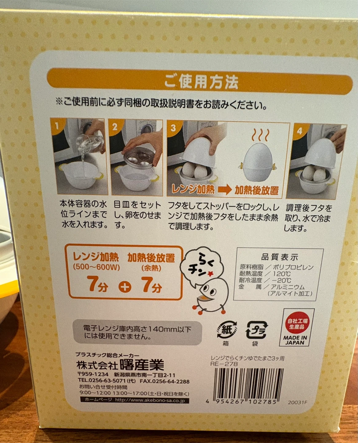 ゆでたまごレンジ調理器です 【情報】 商品:レンジでらくチン ゆでたまご 容量:3個用 型番:RE-278 【状態】 開封済みですが未使用品になります。 箱と説明書付きです。 ご不明点があればお気軽にご連絡ください