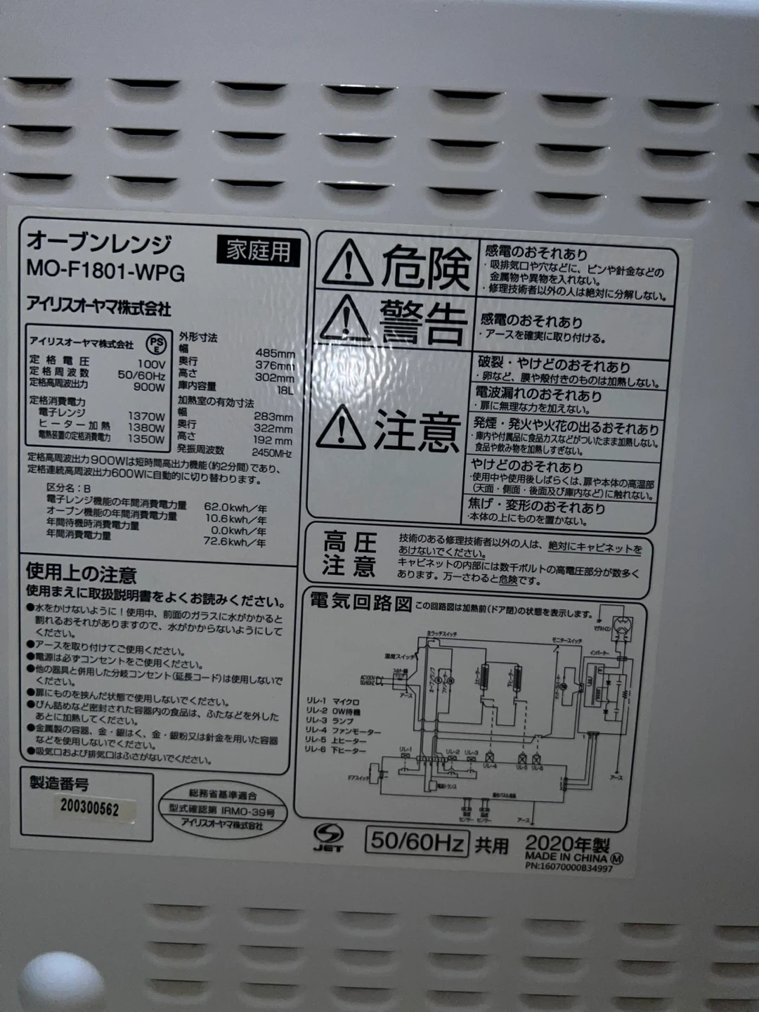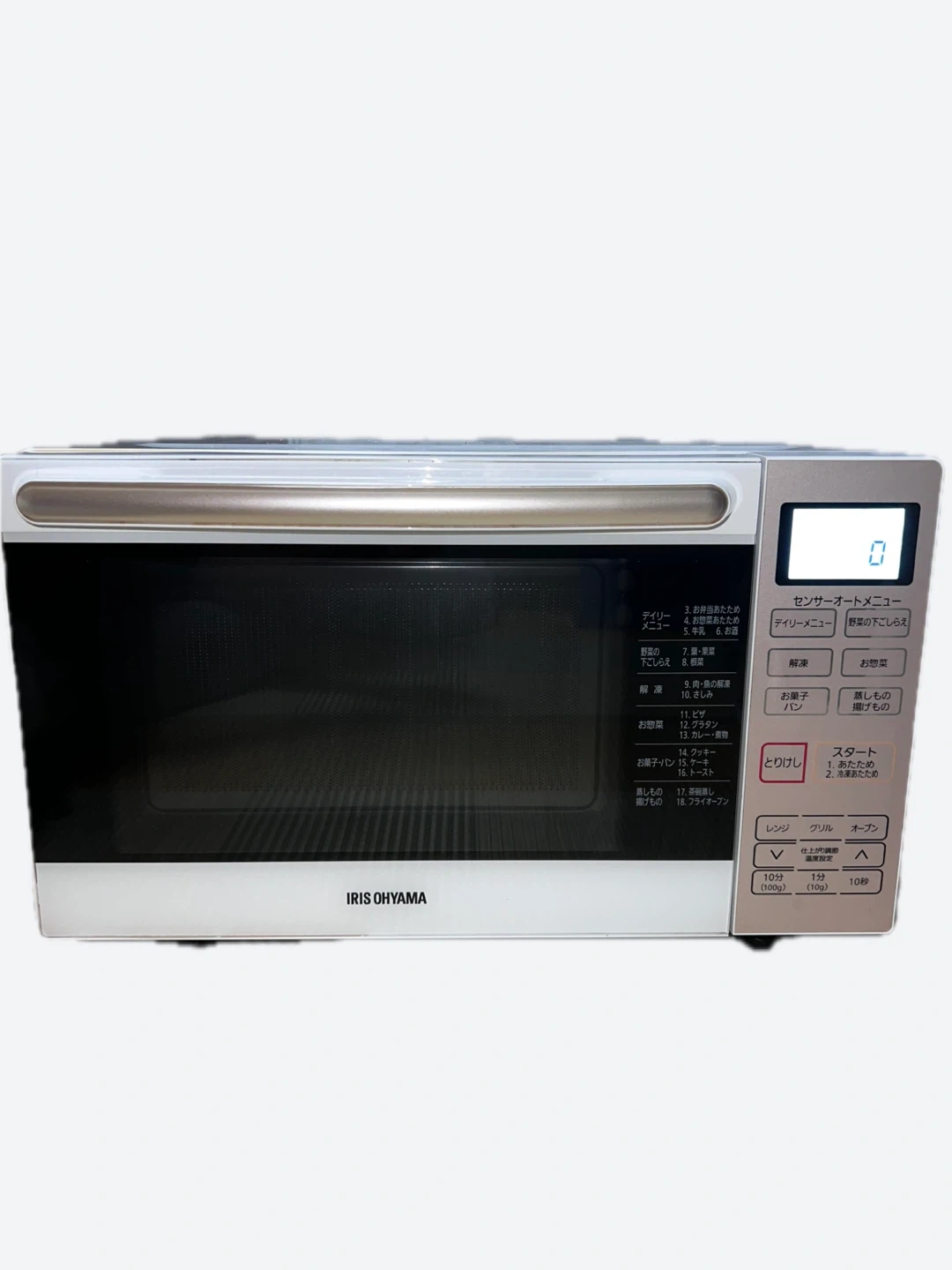 アイリスオーヤマのオーブンレンジです。 普通に使えますがそれなりに焦げつきや擦り傷などあります 角皿付きです 【情報】 ブランド:アイリスオーヤマ 型番:MO-F1801-WPG 年式:2020年製 定格高周波出力:900W 庫内容量:18L 外形寸法:幅485mm×奥行376mm×高さ302mm 【状態】 使用感があります。 庫内に汚れがあります。 中古品であることをご了承ください。