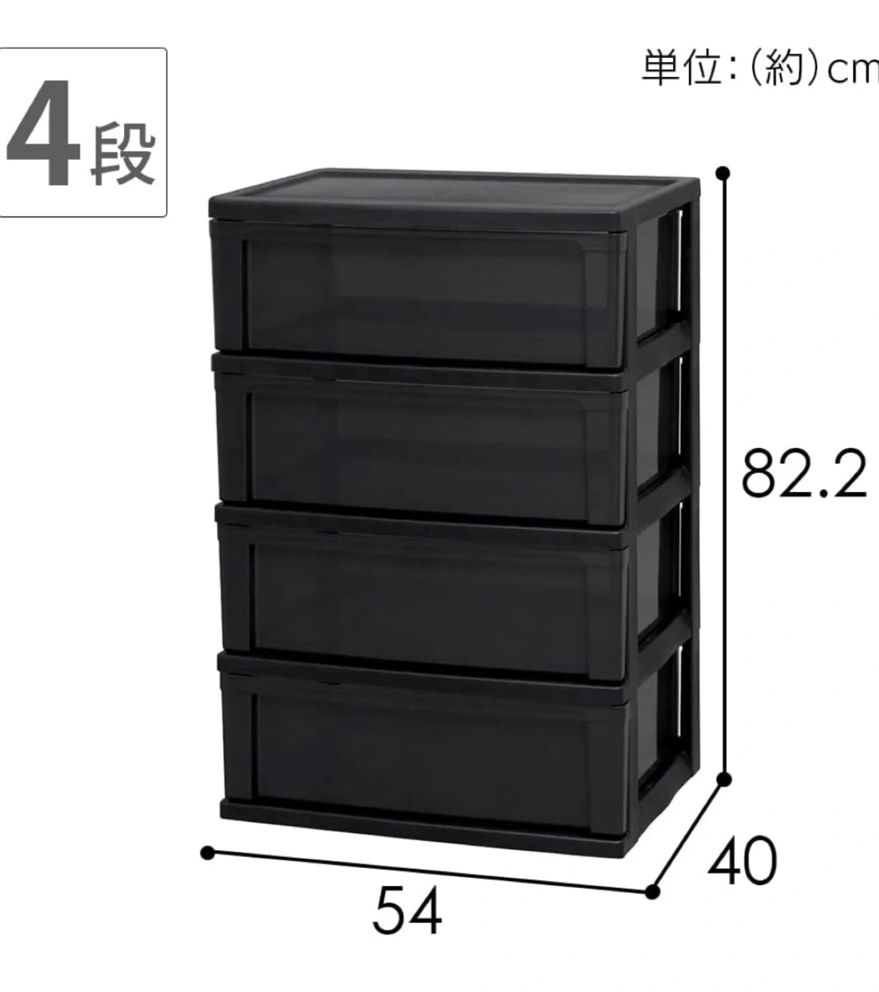 アイリスオーヤマのチェスト4段です 【情報】 ブランド:アイリスオーヤマ 段数:4段 カラー:ブラック サイズ:高さ82.2cm、奥行40cm、幅54cm 中古品であることご了承ください
