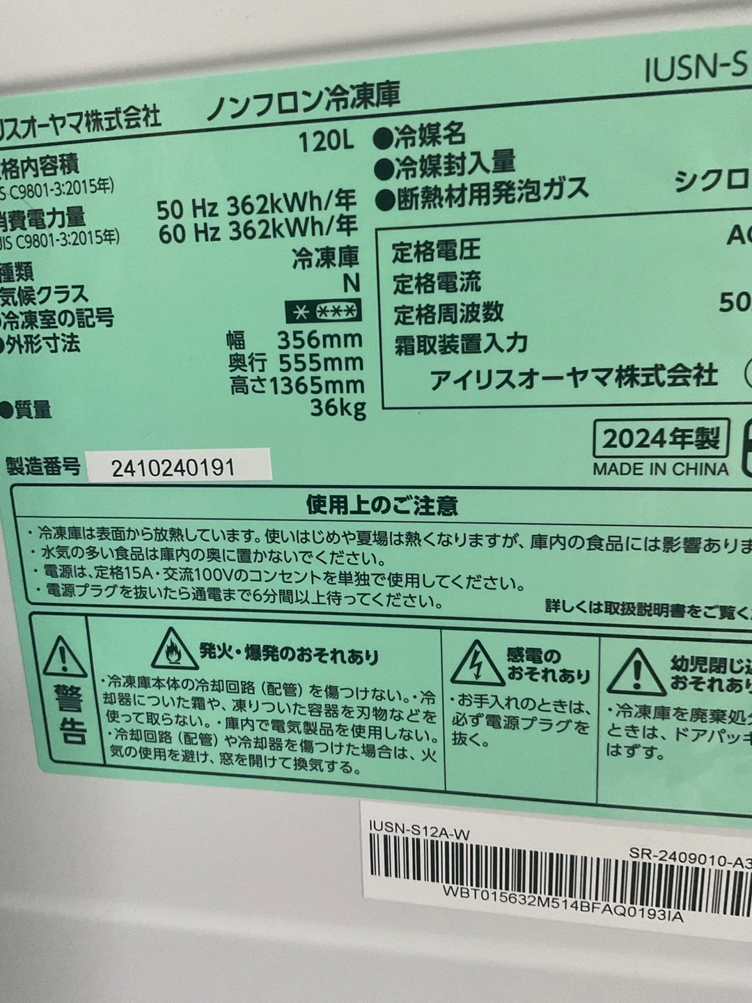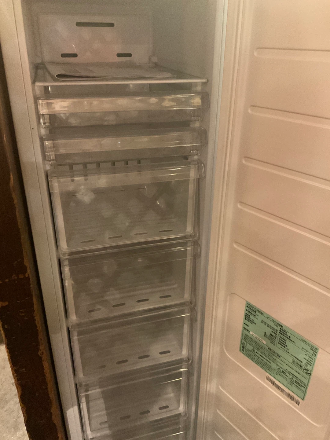 アイリスオーヤマの冷凍庫です。 【情報】 ブランド:アイリスオーヤマ 型番:IUSN-S12A-W 容量:120L 年式:2024年製 サイズ:幅356mm、奥行555mm、高さ1365mm 【状態】 中古品、使用感は少なめです。 中古品であることをご了承ください。 一年前にお店でUberやる為に 45000円で購入もUber辞める事になり不要に、引き出し式で一般家庭でも使い安いと思います