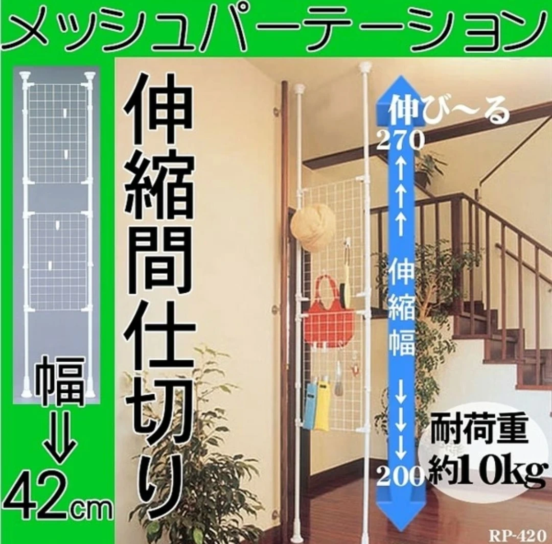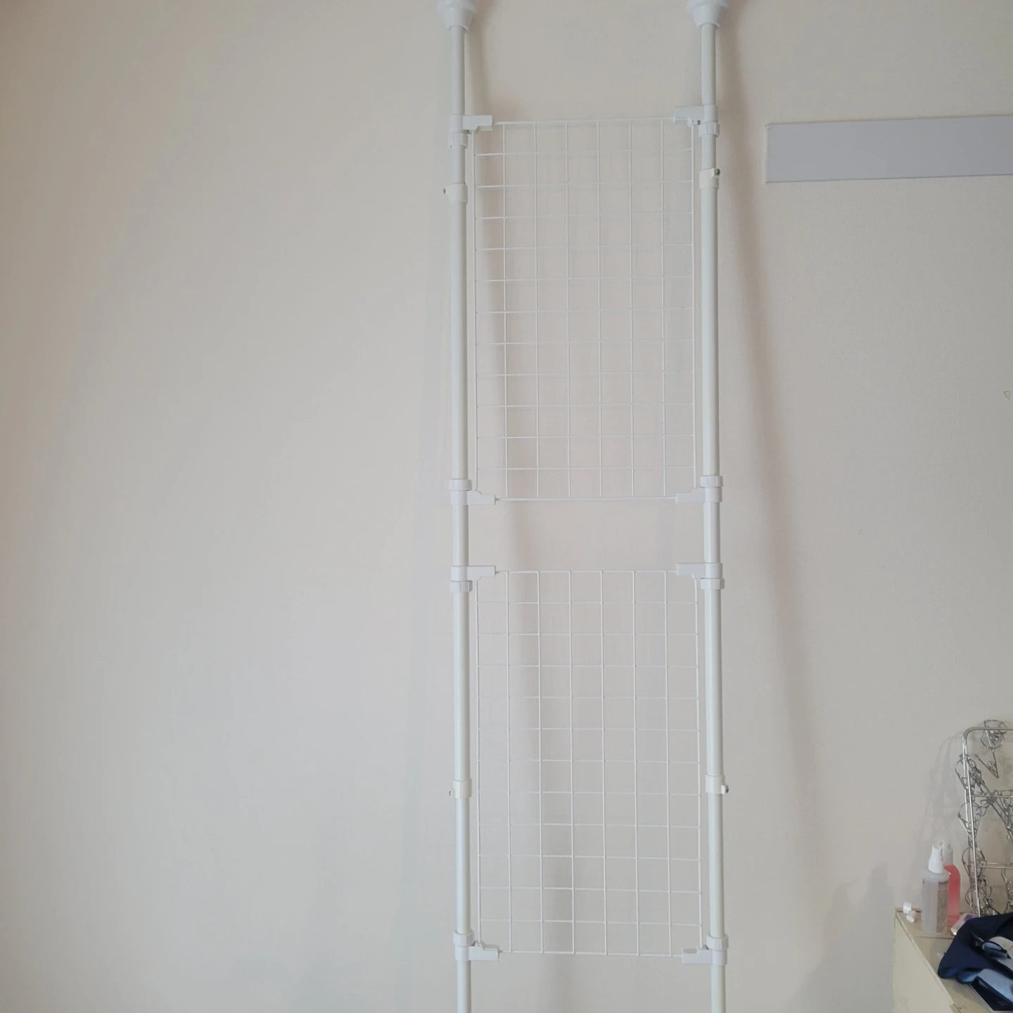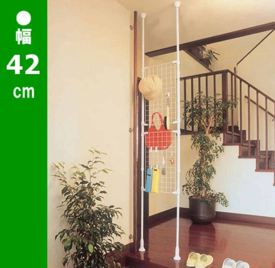 突っ張りラックです。 ・色:白 ・状態:使用感あり 画像にてご確認ください。 規定サイズより長くして止めていた事があり、ネジ穴が空いてしまっている箇所がありますが使用上は問題なかったです。 ●サイズ(約) 幅42×奥行7×高さ200〜270(cm) ●主要材質 ポリプロピレン、ABS樹脂、塩ビ被覆鋼管、スチールワイヤー ●耐荷重(kg) パネル1ヶ当り:約10kg フック1ヶ当り:約1kg