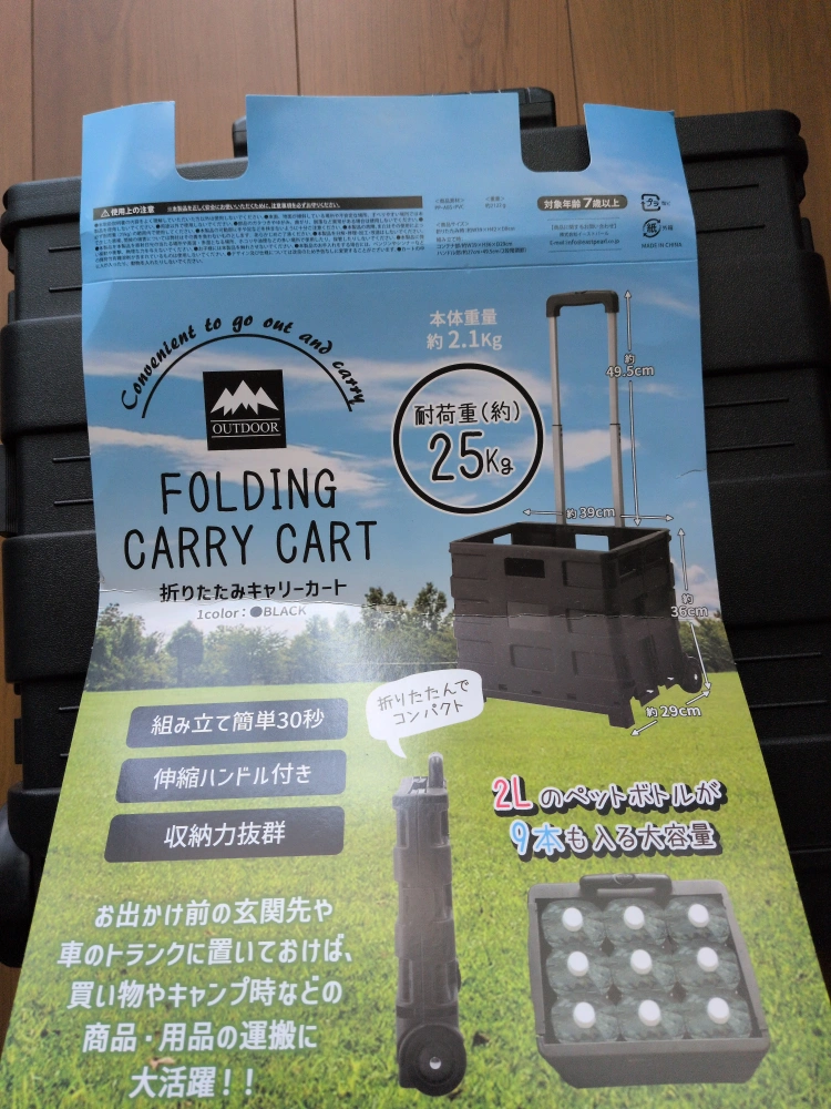 アウトドアの折りたたみキャリーカートです。 【情報】 耐荷重:約25kg カラー:ブラック 【状態】 未使用品