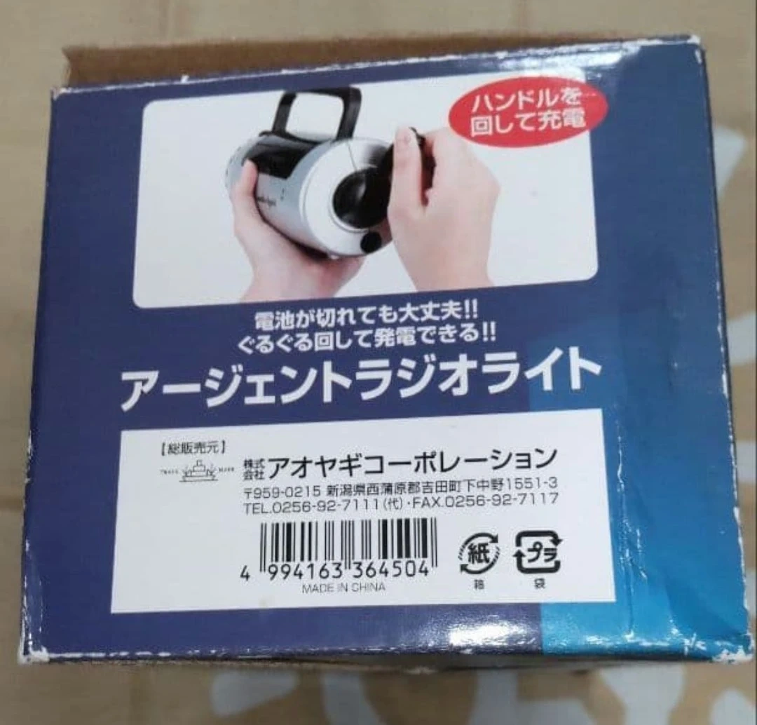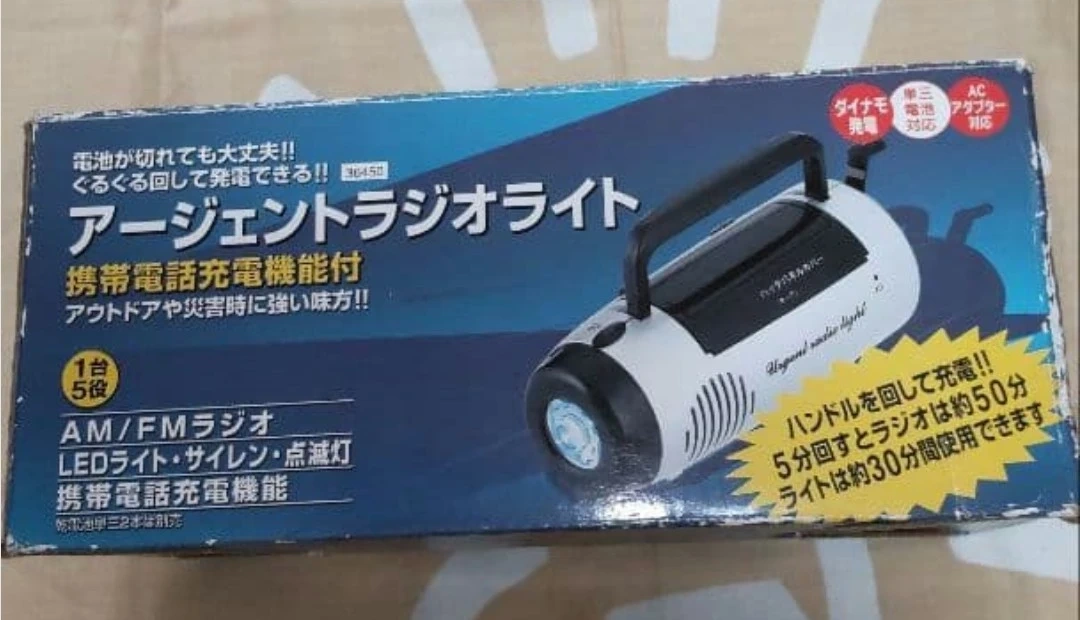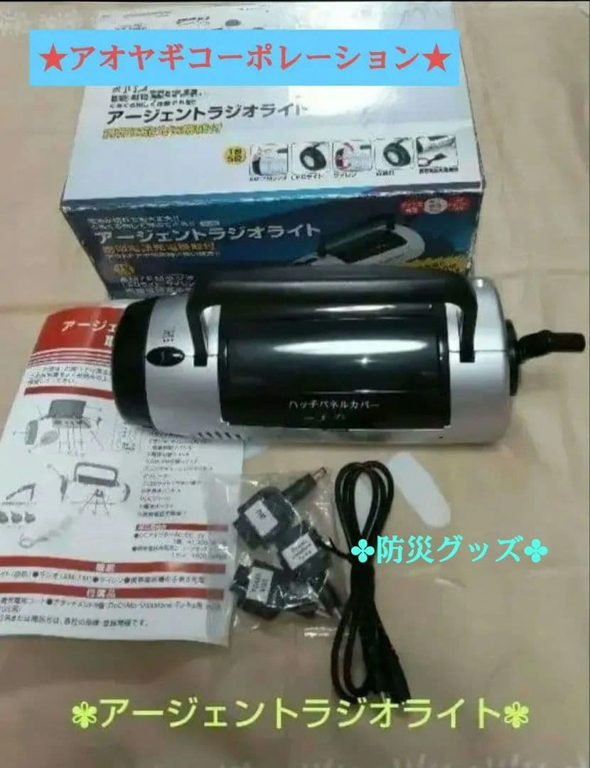 《アオヤギコーポレーション》1台5役【アージェントラジオライト】 ダイナモ発電・単3電池対応・ACアダプター対応 1台でAM/FMラジオ・LEDライト・サイレン・点滅灯・携帯電話充電機能の5役 2005年に購入しましたが、動作確認の為に主人が使用しただけで、箱に入れて保管していました。 傷や指紋の様な痕は多少ありますが、使用感は無いと思います。 電池ボックスのコイルに経年変化による錆が少しありますが、使用可能です。 サイレン・ラジオ・手巻き発電は、動作確認済みですが、LEDライトが切れている為か点灯しません。 携帯電話充電機能付きですが、充電コードのアタッチメントがかなり古い携帯電話のものですので、動作確認はしていません。 箱の状態は悪いです。 中古品になりますので、商品の状態をご理解頂ける方のご購入をお願い致します。 #防災グッズ #アウトドア #アオヤギコーポレーション #アージェントラジオライト #1台5役 #ラジオ #サイレン #LEDライト #点滅灯 #ダイナモ発電
