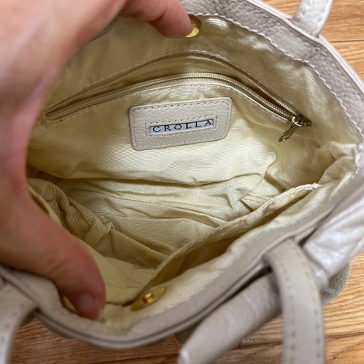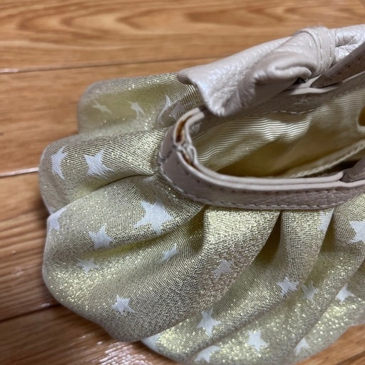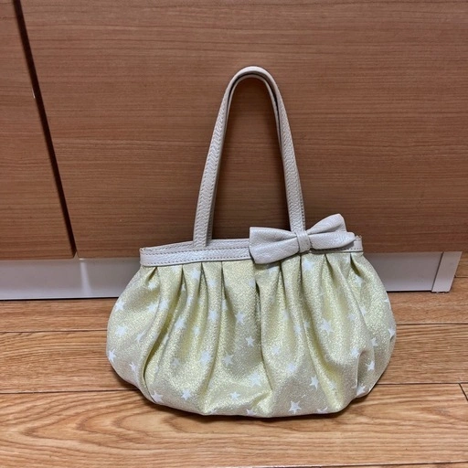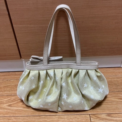 アクアガールのCROLLAのパーティバックです。 リボンと星柄、ギャザーデザインが可愛らしい印象です。 結婚式やパーティーなどのフォーマルな場所や、普段使いにも。 丸底のため見た目より物が入ります。 内側にポケットが2つあります。 【カラー】ゴールド系 【デザイン】星柄 【ブランド】CROLLA 【装飾】リボン 【開閉】ファスナー 【ポケット】内側にオープンポケット1つとファスナーのポケットが1つ 【サイズ】 全体 24×15cm バック底 19.5×11.5cm 持ち手 15cm ※素人採寸のため誤差はご容赦ください。 使用頻度は低いですが、上から見た箇所に少し変色があります。写真でご確認ください。 受け渡しは小田急線 狛江周辺、登戸駅〜下北沢駅で、土日祝日でご相談させてください。 平日は夕方、相談によっては可能です。 ドタキャンされない方、中古品にご理解のある方のみお問い合わせください。 よろしくお願いいたします。