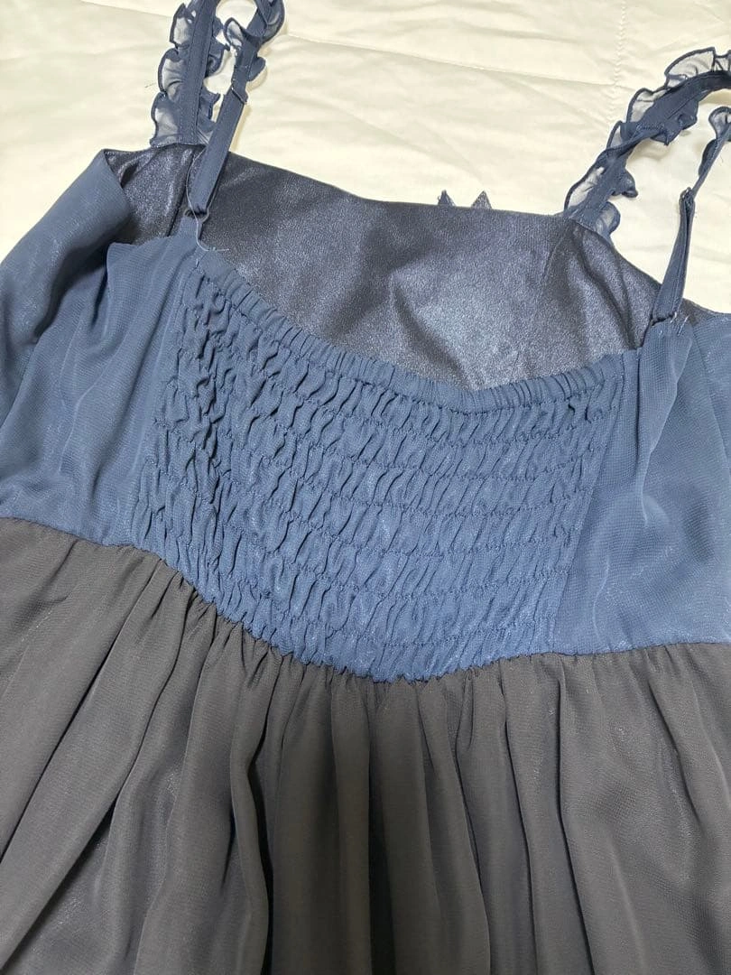 花のモチーフとパールビーズが施された、軽やかなシフォンのノースリーブワンピースです。裏地付き。 肩紐部分は長さ調整可能です。 普段使いや結婚式・二次会にいかがでしょうか。 1度のみ着用しています。 - 色: ネイビーとブラックのコンビネーション - 装飾: 花のモチーフとパールのビーズ - デザイン: ノースリーブ、ひざ丈、フレアシルエット - 素材: 軽量なシフォン素材 - レース: 裾にレース装飾 ご覧いただきありがとうございます。 ご希望の方はお気軽にご連絡ください。