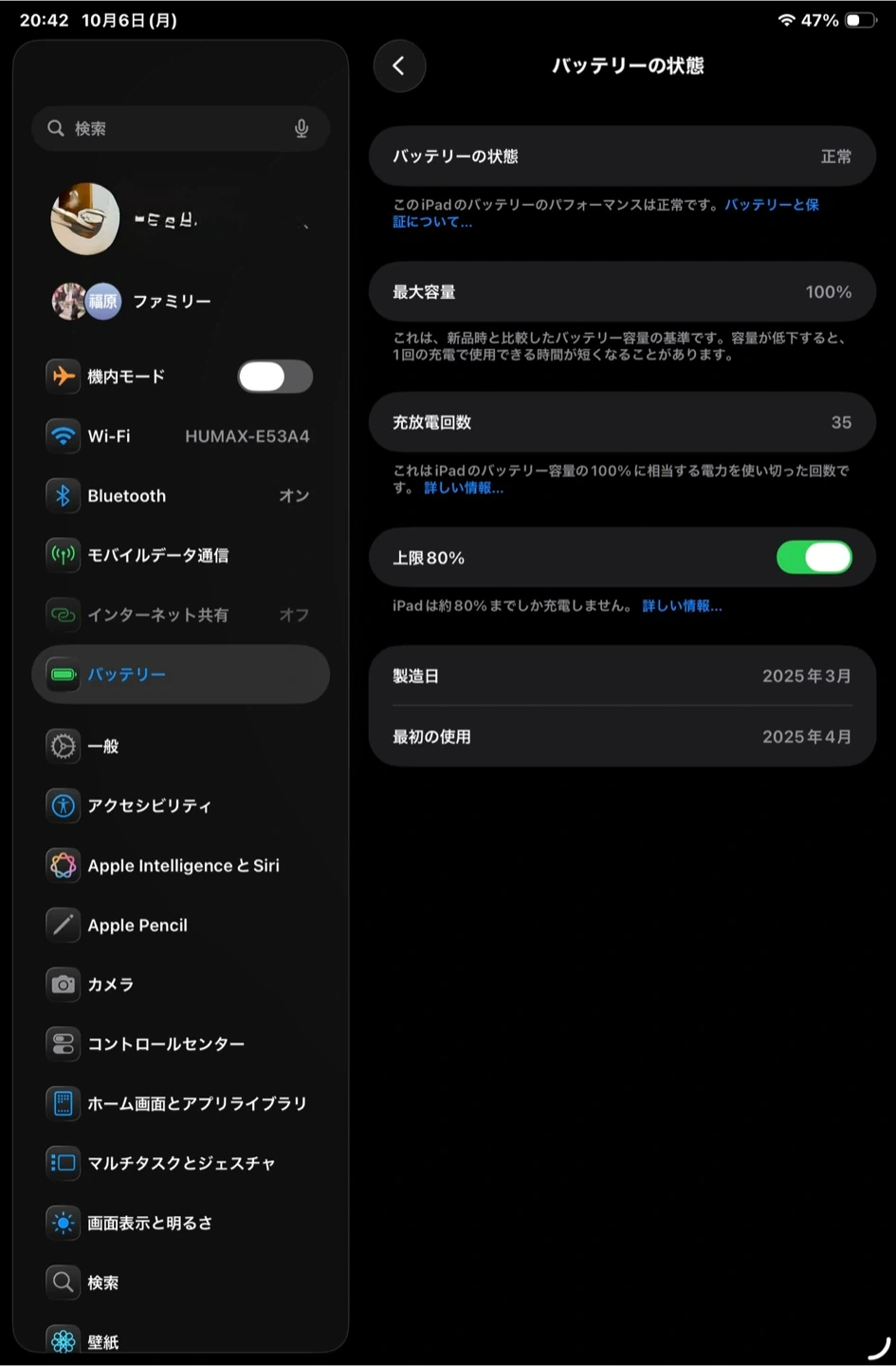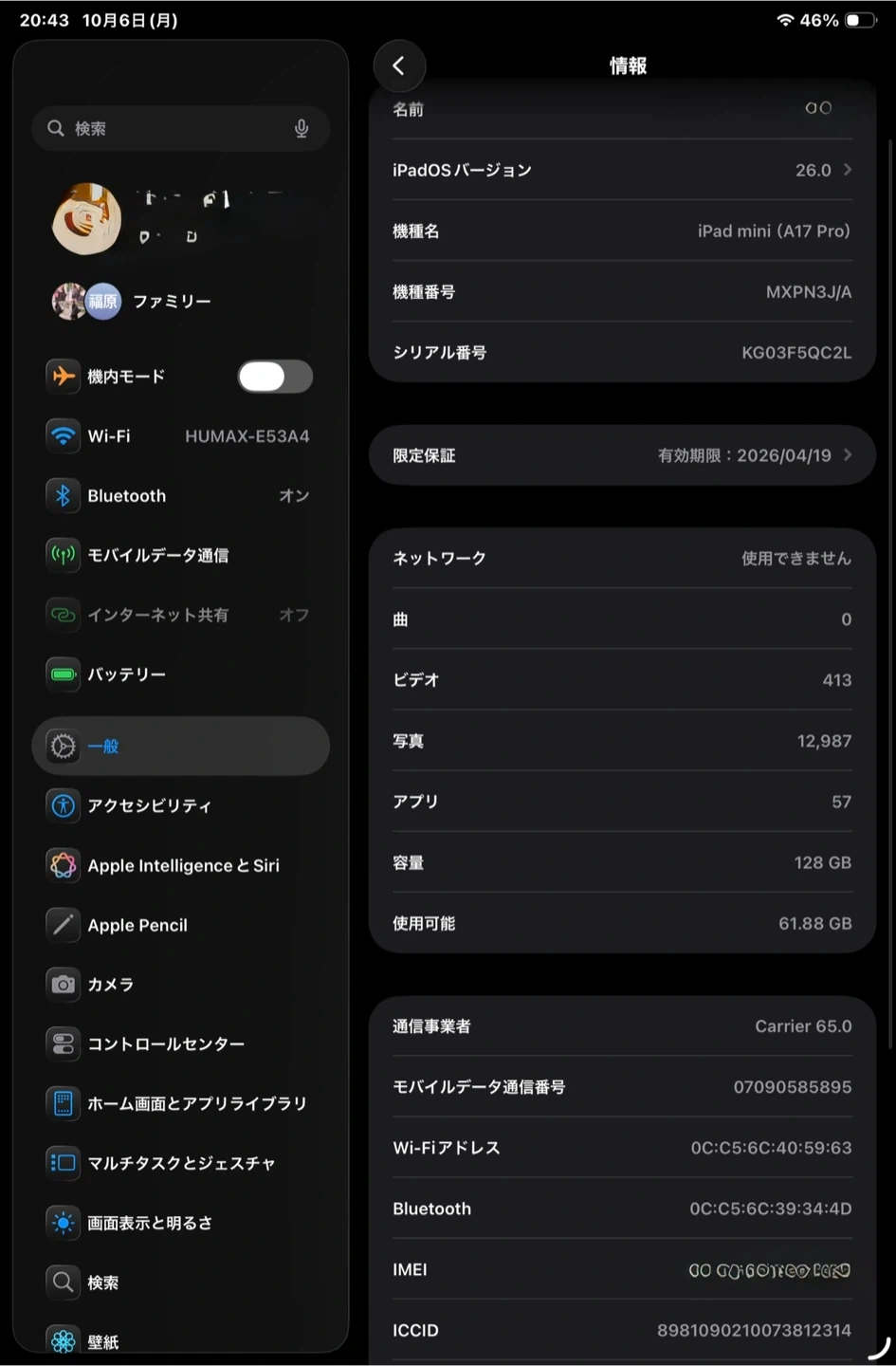 アップルのiPad miniです 【情報】 ブランド:アップル 製品名:iPad mini (A17 Pro) 通信方式:Wi-Fi+Cellular 容量:128GB 型番:MXPN3J/A 【状態】 目立つ傷なし バッテリーの最大容量:100%(画像参照) 充電回数:35回(画像参照) 製造日:2025年3月(画像参照) 最初の使用:2025年4月(画像参照) 【付属品】 箱、PITAKAケース、クリアケース複数、Smart Devil 強化ガラスフィルム2枚 中古品であることご了承ください