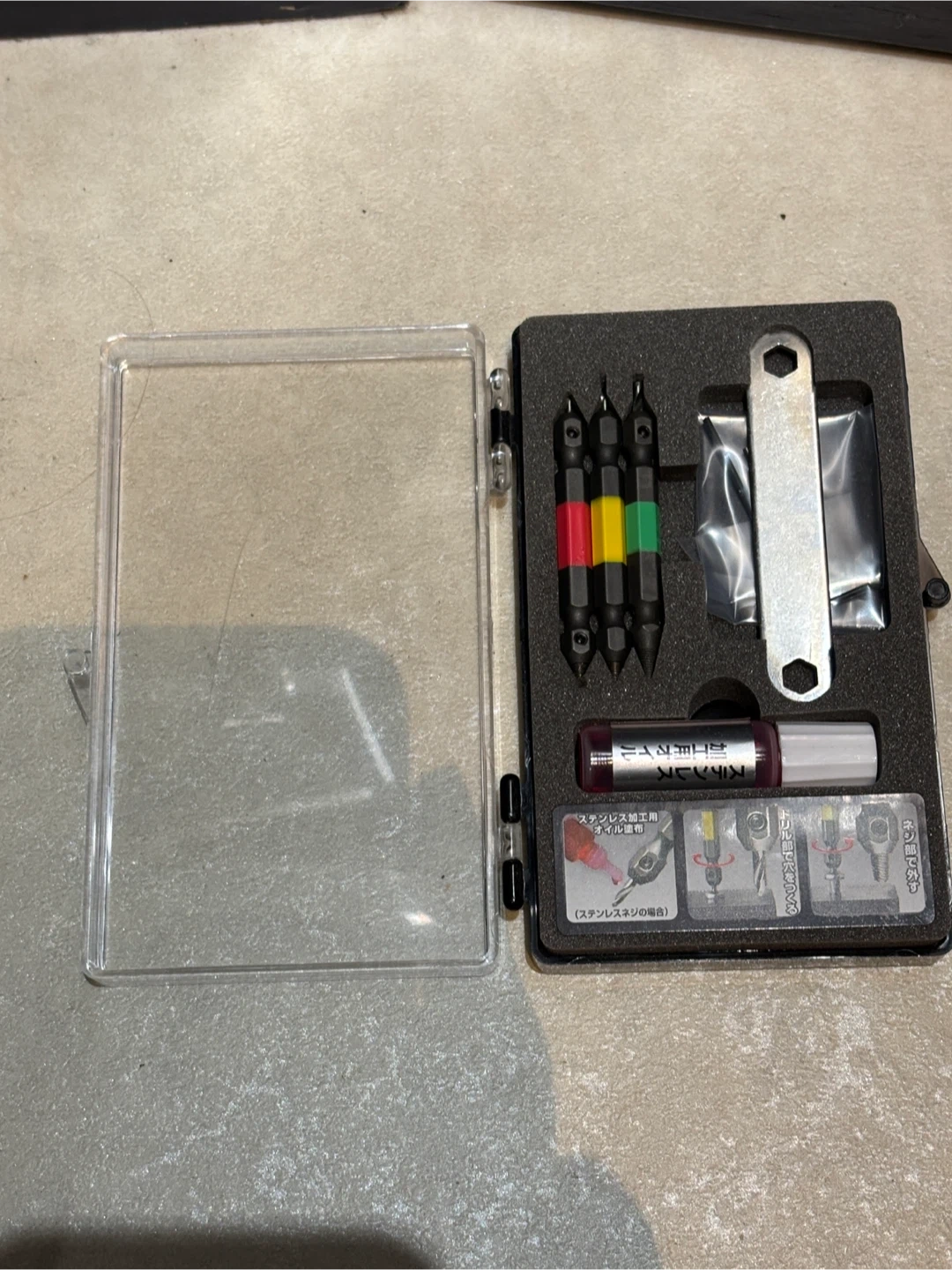 こちらの商品です。 https://amzn.asia/d/hI6VXJF 赤色のネジに当てる部分だけ消耗しています。 それ以外は未使用です。 赤と黄色のドリルは未使用のスペアがついています。 (こちらの商品には緑のスペアは付いていませんでした。)