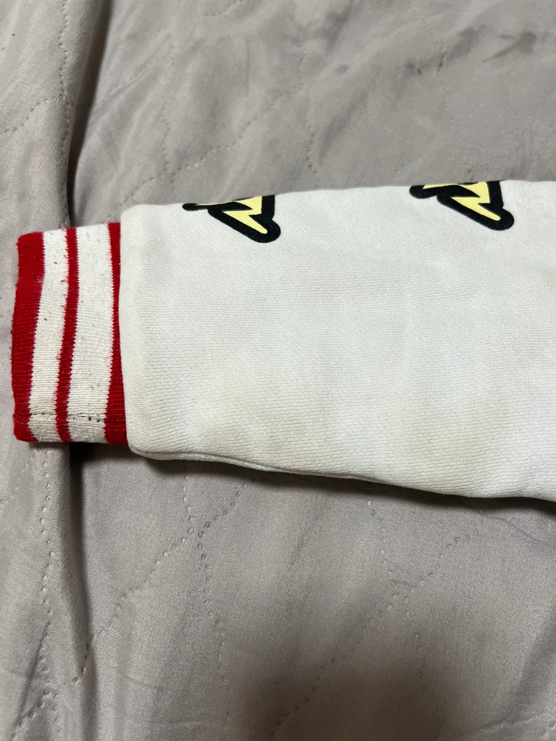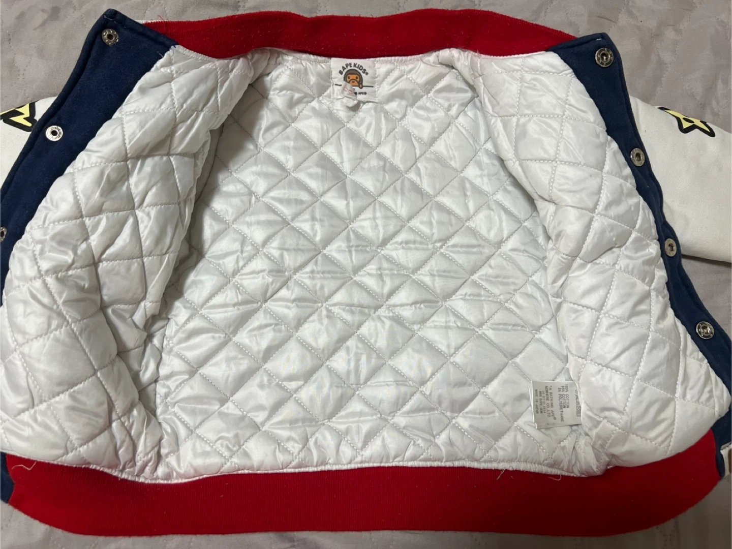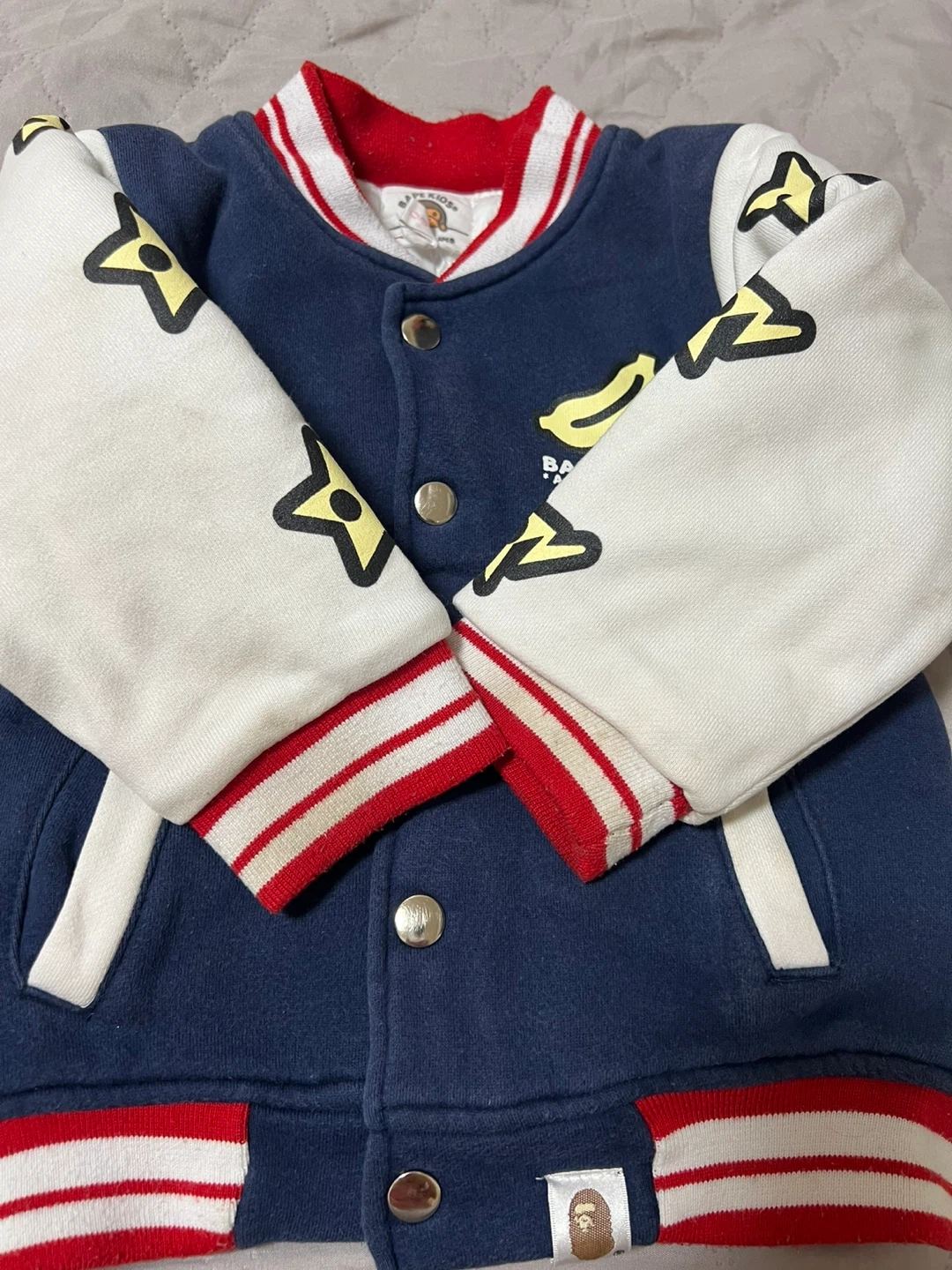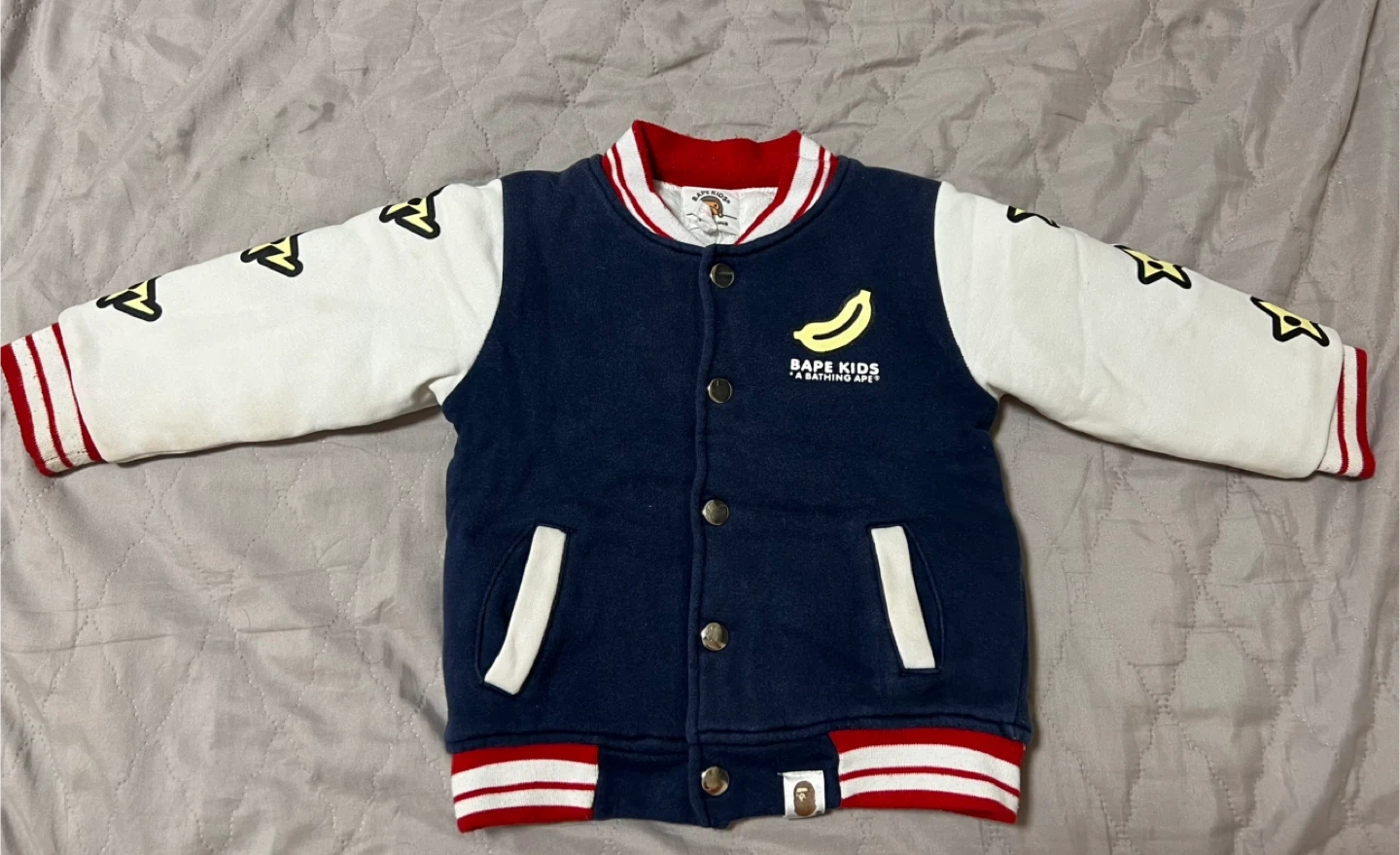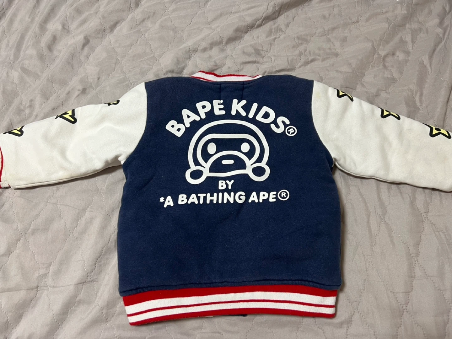 アベイシングエイプのキッズジャケットです ・ブランド:アベイシングエイプ ・サイズ:不明 ・色:ネイビー、白、赤 ・デザイン:ロゴ、バナナ ・状態:使用感あり、袖に汚れあり 中古品であることご了承ください