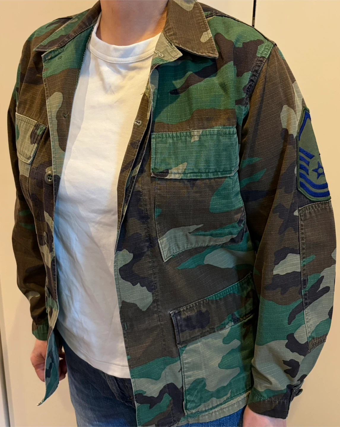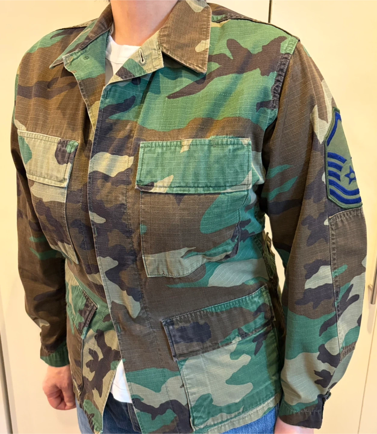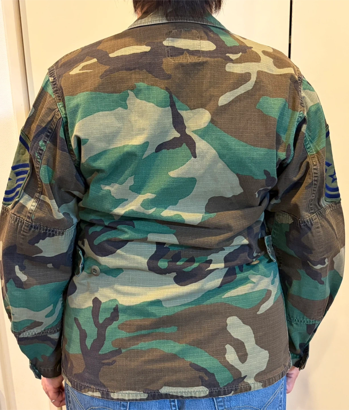 アメリカ軍 迷彩デザインのX-Small Shortミリタリージャケット、肩に青いパッチ付き。 - カラー: 迷彩 - サイズ: X-Small Short - 胸囲: 最大33インチ - 身長: 63-67インチ - デザイン: ミリタリージャケット - 特徴: 肩に青いパッチ 女性サイズでMって言う感じでしょうか。 何故かポケットは入り口が縫い合わされており機能は果たしません。 ご覧いただきありがとうございます。