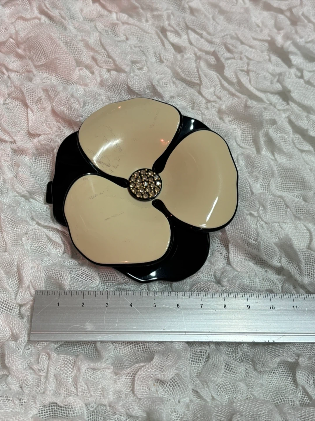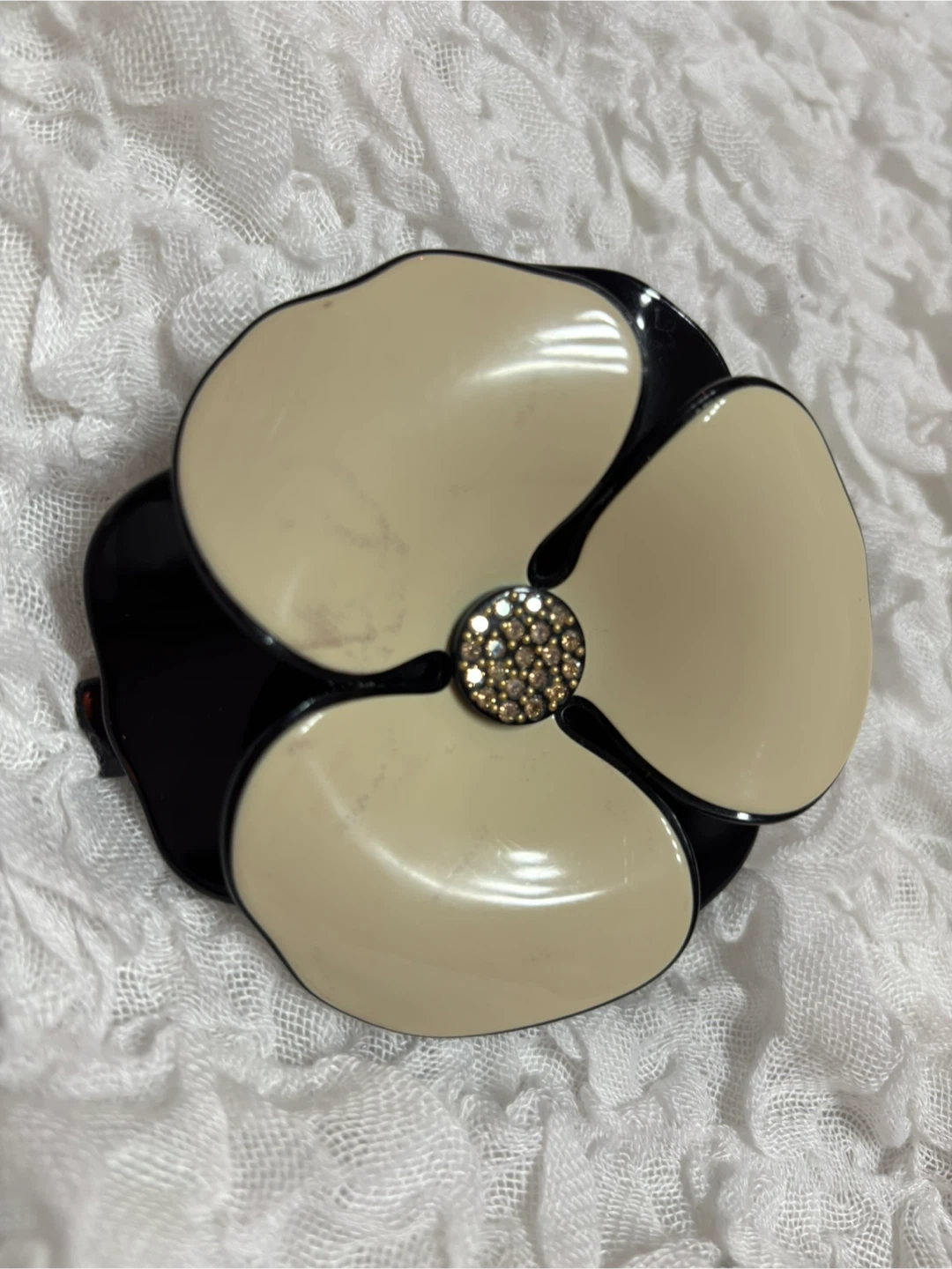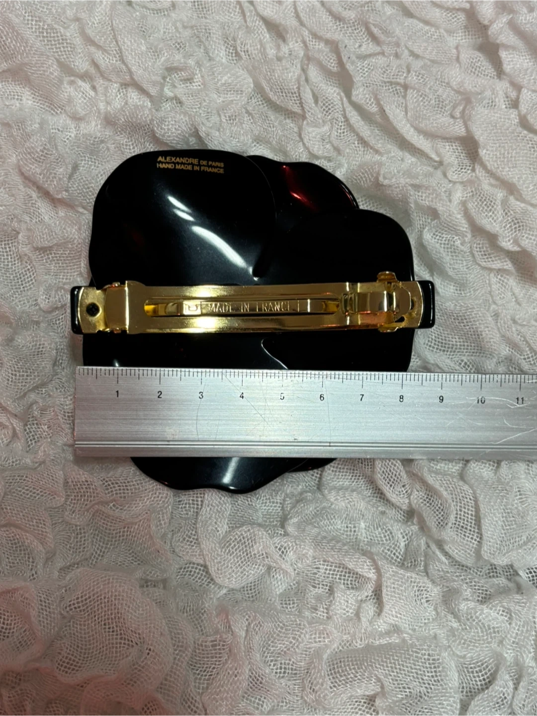 アレクサンドル ドゥ パリ のバレッタです。 保管状態が悪かった(他のヘアアクセサリー類と一緒にしまい込んでいた)ため、花弁部分に着色汚れ(色移り)が出来てしまいました。 自分なりに重曹ペーストなど試してみましたが落ちませんでした。ショックです。 バレッタ(髪留め)としての機能は十分に果たせるので訳アリ出品です。 装飾素材はアセテートとスワロフスキービーズです。 ビーズの取れなし。 小傷あり。 金属パーツに若干くすみあり。 着色汚れアリアリ。 中古品ですので神経質なかたはご遠慮下さい。