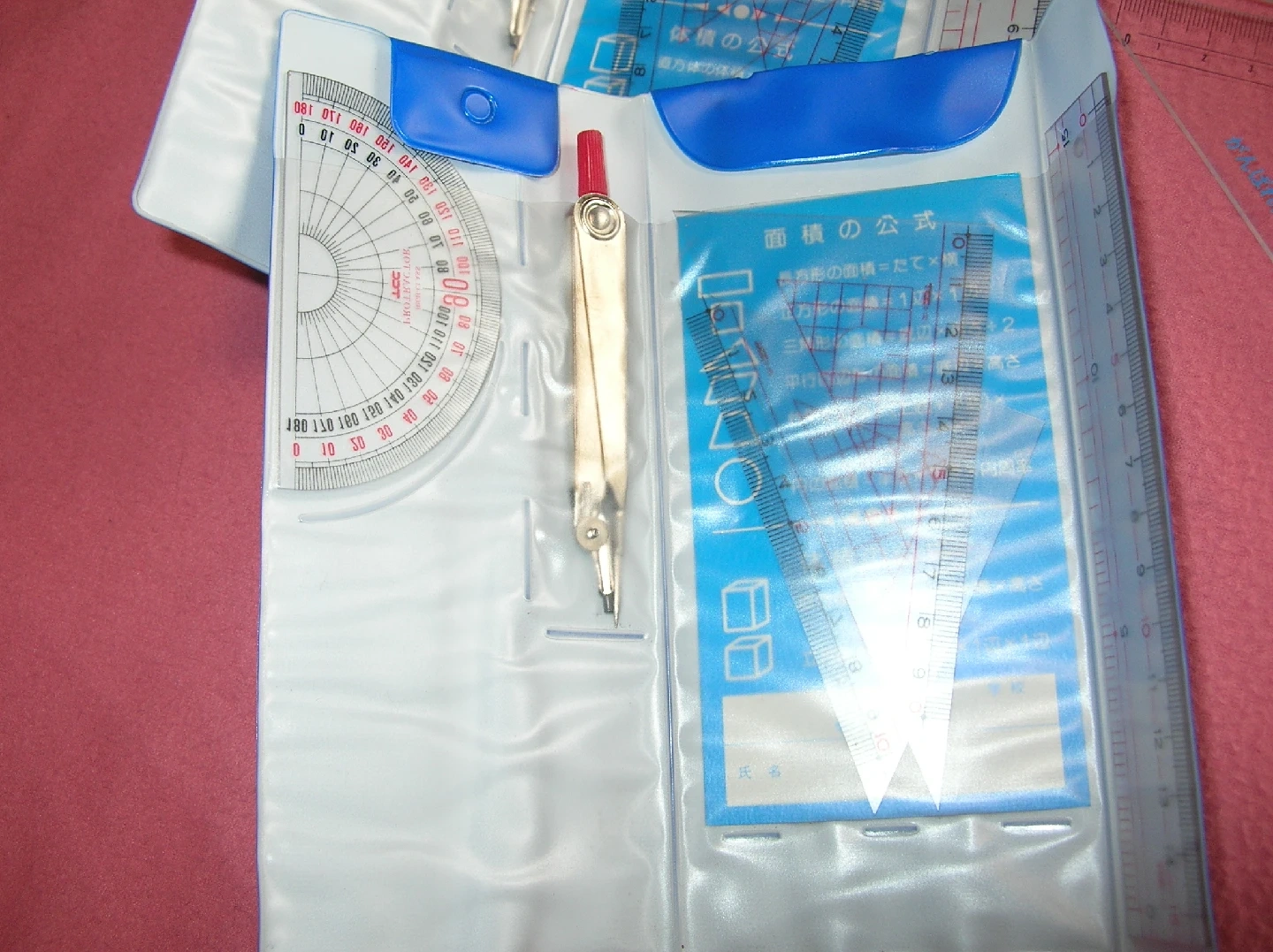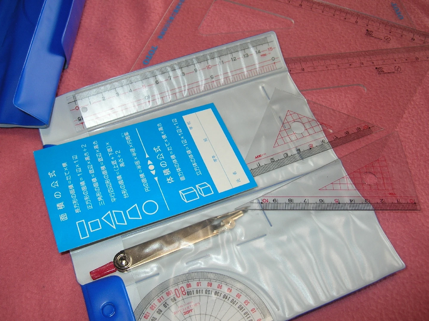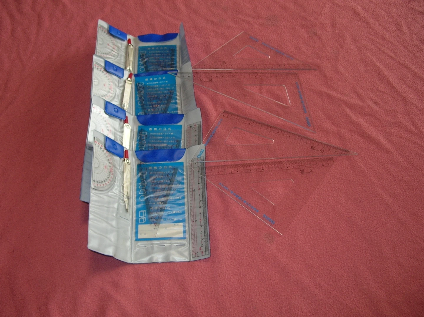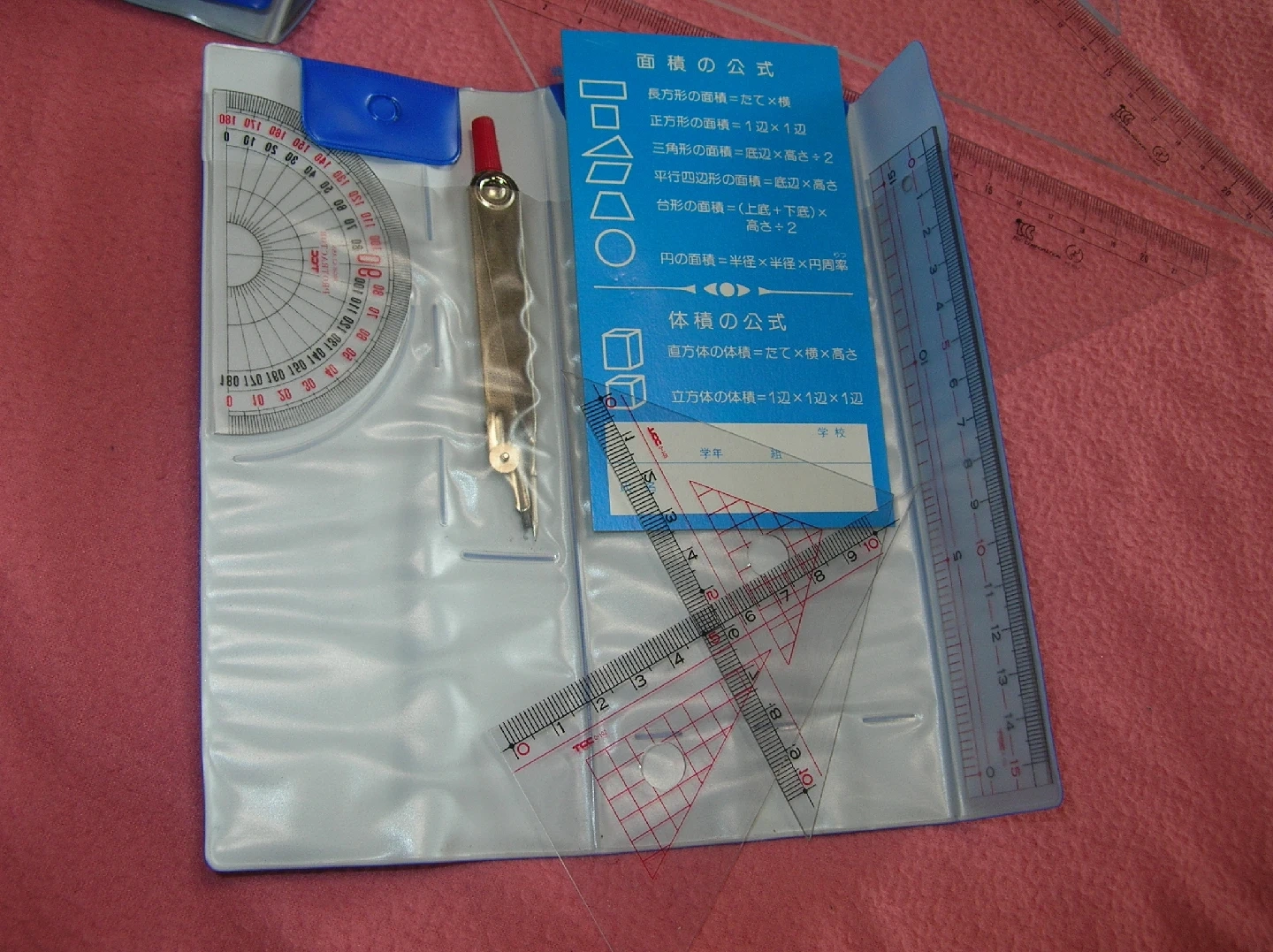 アングルセット中身は、三角定規、直線定規、分度器、コンパスです。2セットは、直線定規がありません。また22センチの三角定規もお付けします。面積の公式が入っていますので、小学校中学年ぐらいが対象です。