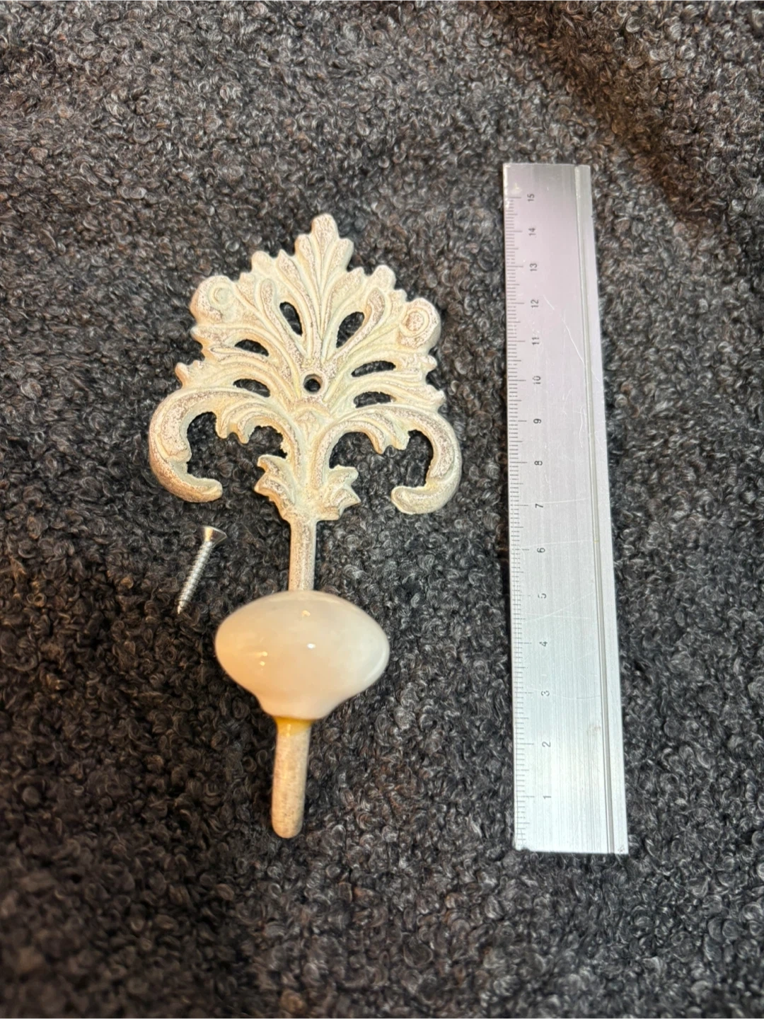 ズシリとした重みのあるアイアン×陶器のフックです。 ホワイト アンティーク調で元からシャビーな仕上げになっています。 木ネジ付き。 中古 神経質なかたはご遠慮下さい。