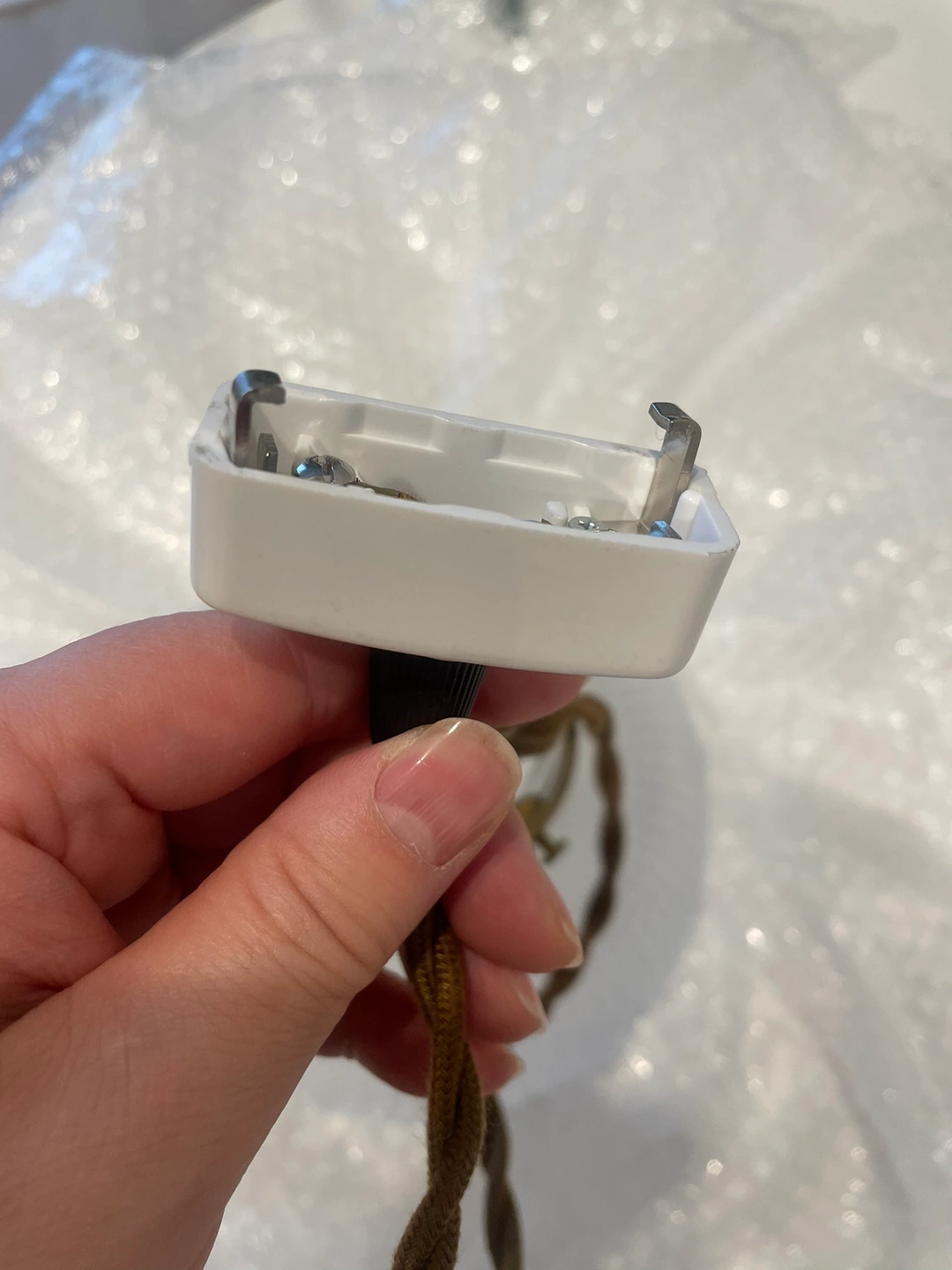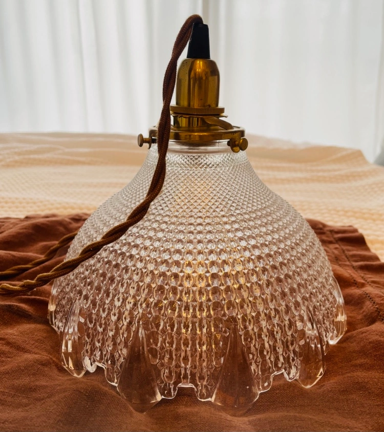 10年くらい前に自由が丘のモモナチュラルにて購入したもの。購入から約2年程度使用しましたが、その後、倉庫保管。目立った記事や汚れはありません。切子硝子のような感じで灯りを灯すと、とても綺麗です。ヨーロッパア ンティーク風の雰囲気が出ます。玄関やドレッサー付近に吊るすと可愛いです。現在の家は、備え付けのシーリングライトで設置できないのと、インテリアの好みが変わったので、使用していません。お好きな方に大切にしていただけると嬉しいです。ご検討ください。