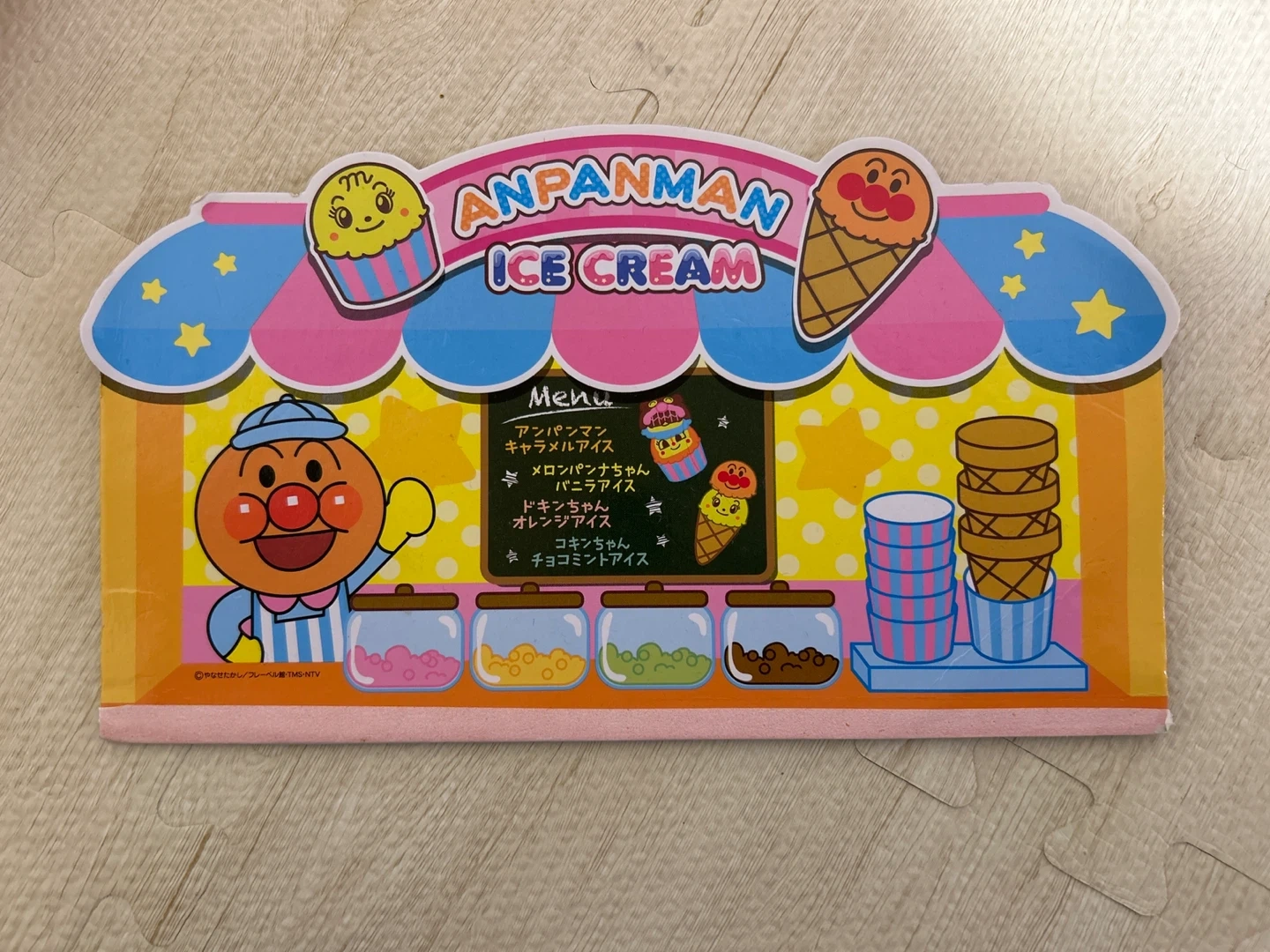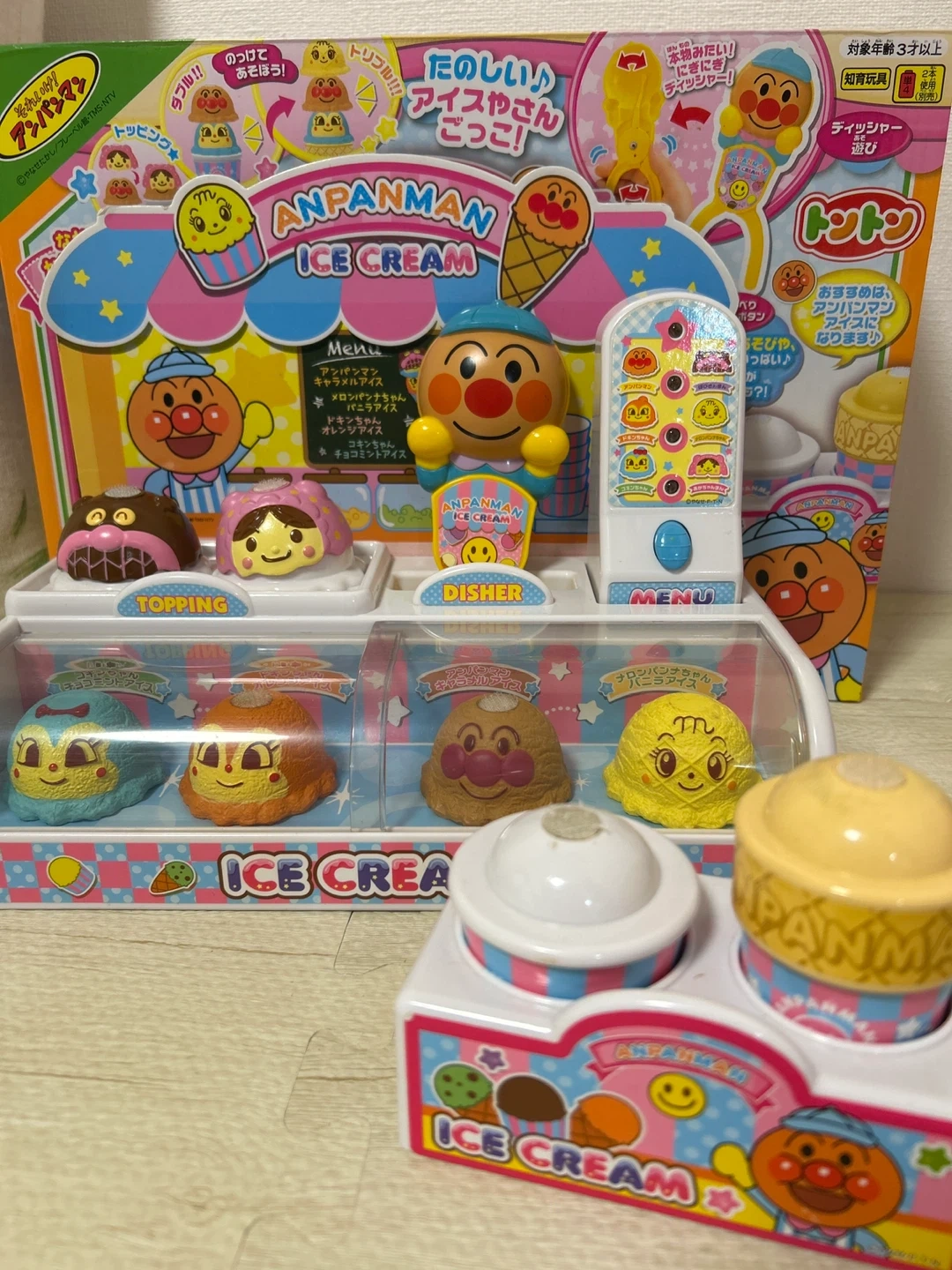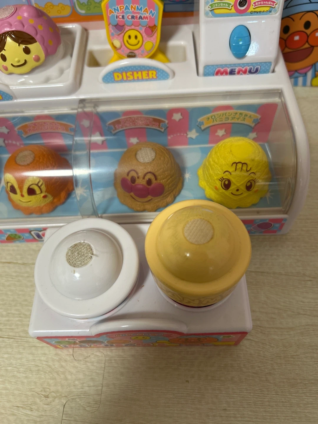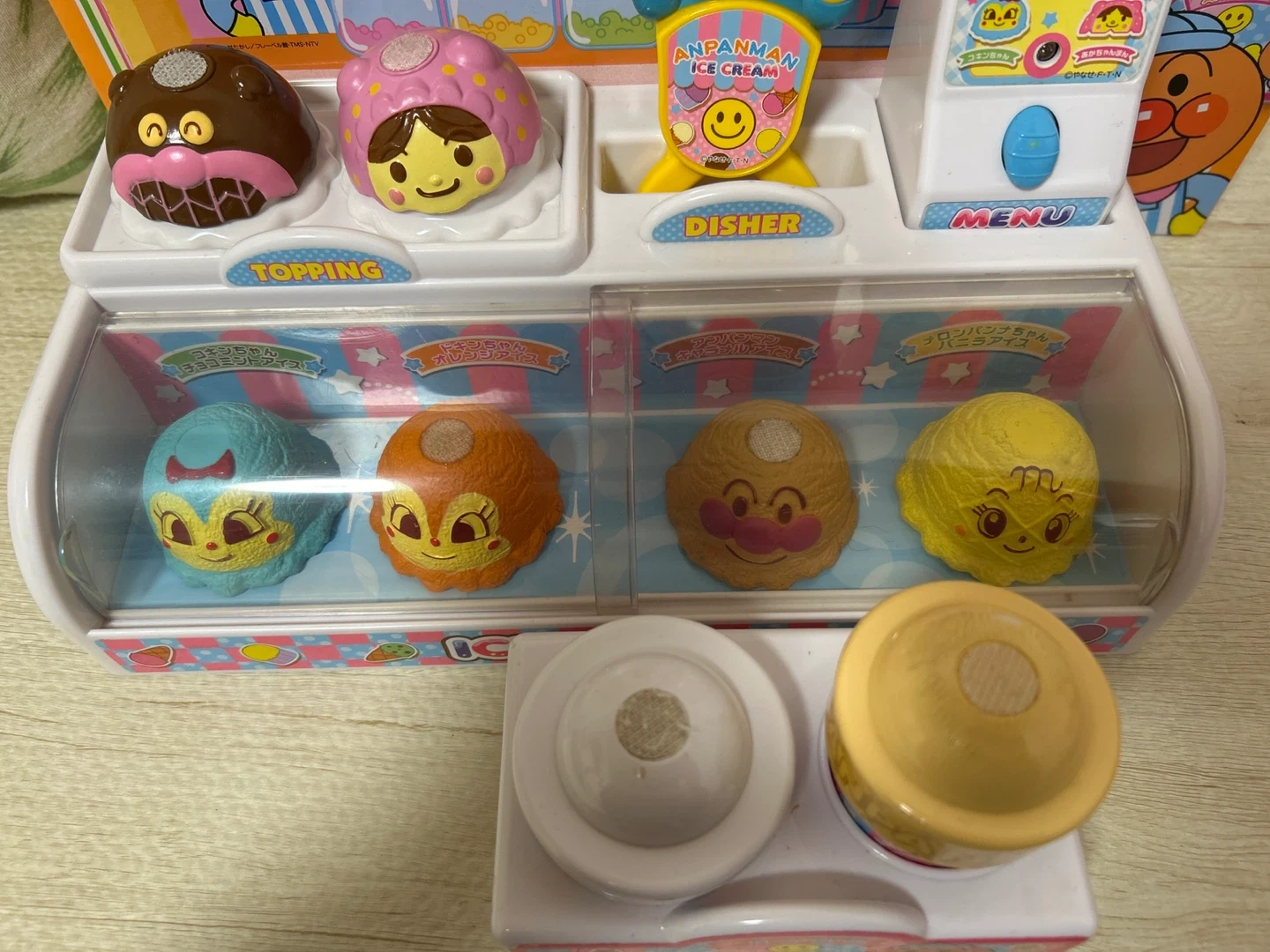 アンパンマンのアイスクリーム屋さんのおもちゃ 箱あり 使用感はかなりありますが、本体起動可能 テスト済み 電池なし 2枚目、テープ剥がれあり 3枚目汚れ、傷あり 4枚目はまらなくなったので、マスキングテープで直しあり 中古品であることご了承ください ご理解い頂ける方にお願いします 場所(近場であれば相談可能)、値段、他のものとまとめてご希望、ご相談可能です
