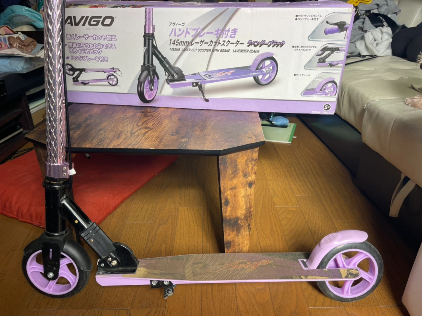 アヴィーゴのキックスケーターです。 ・カラー:ラベンダー、ブラック ・145mmレーザーカットスクーター ・ハンドブレーキ付き ・箱あり ・使用感あり 中古品であることご了承ください