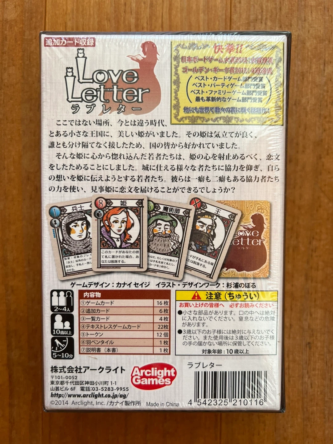 アークライトゲームズのLove Letter(ラブレター)ボードゲームです。 【情報】 ブランド:アークライトゲームズ 商品名:Love Letter (ラブレター) 内容物: ゲームカード 16枚 追加カード 4枚 一覧カード 6枚 テキストレスゲームカード 22枚 トークン 12個 カードファイル 1枚 説明書(本書) 1枚 ご不明点があればお気軽にお尋ねください。