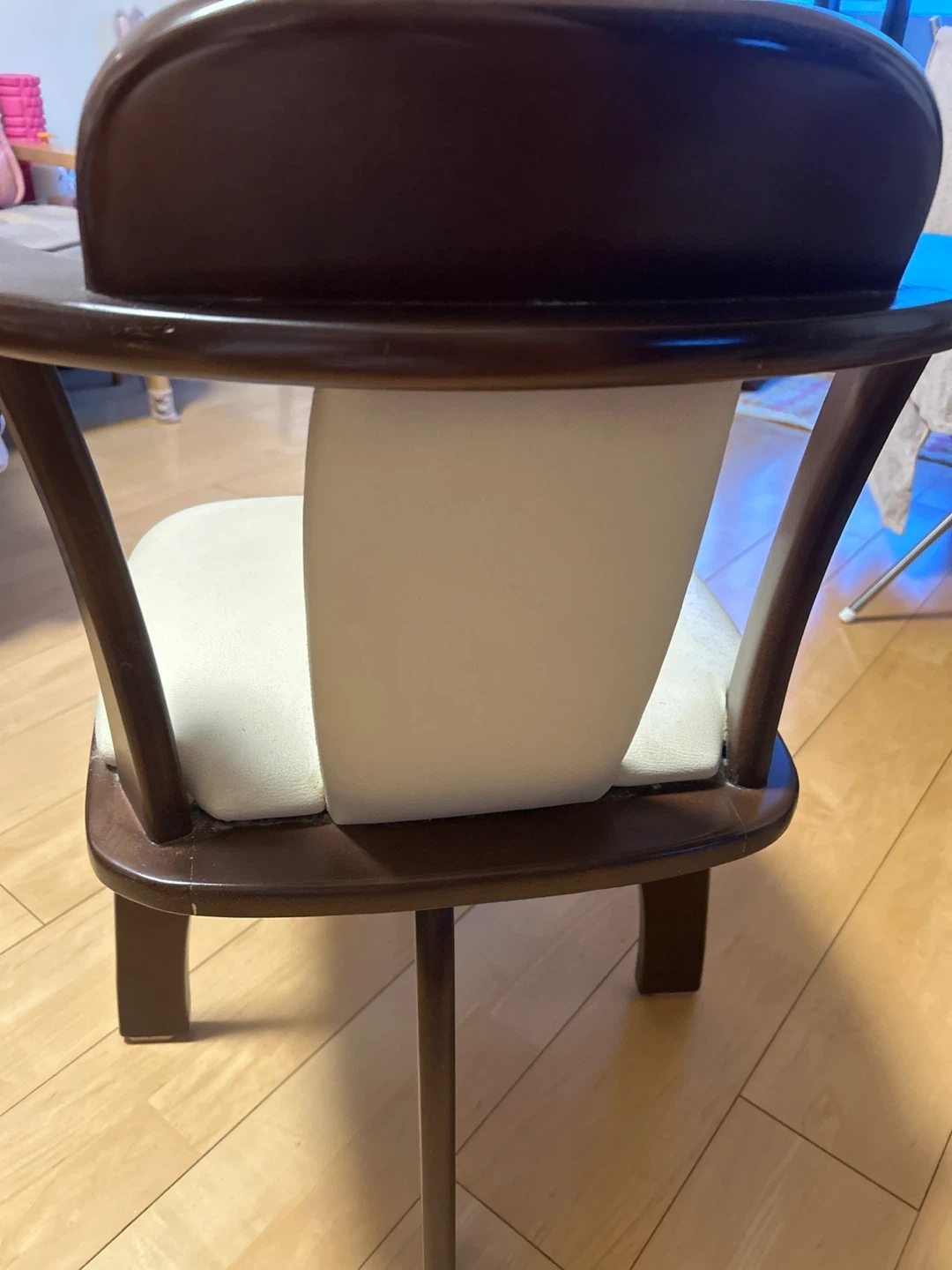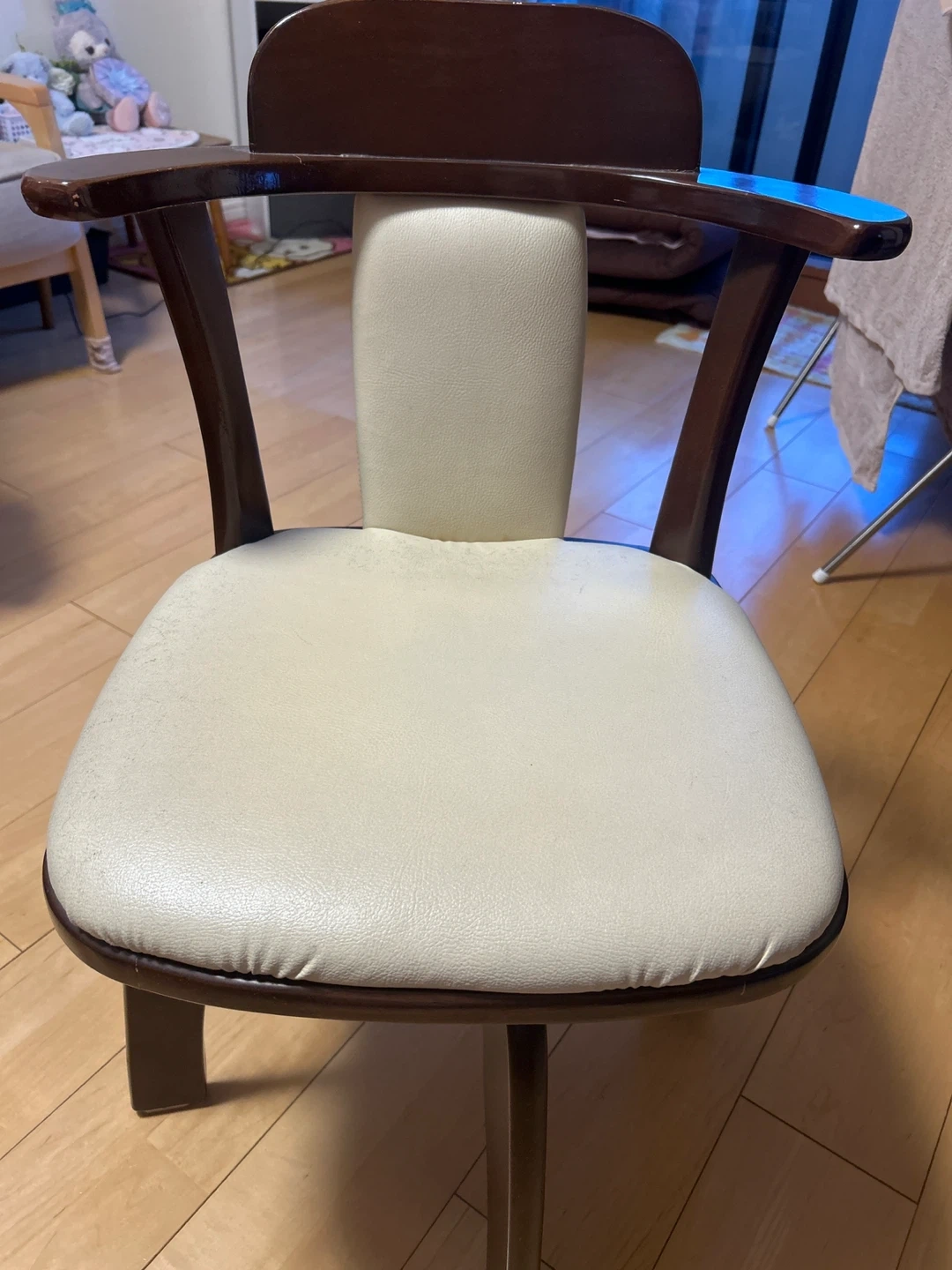 回転椅子です 【情報】 商品名:アーツ チェア 外形寸法:幅500mm x 奥行き510mm x 高さ710mm 構造部材:ラバーウッド材 表面加工:アミノアルキド塗装 張り材:合成皮革(PVC) クッション材:ウレタンフォーム 【状態】 使用感はありますが、目立つ傷はありません 中古品であることご了承ください 座面は 回転式です。