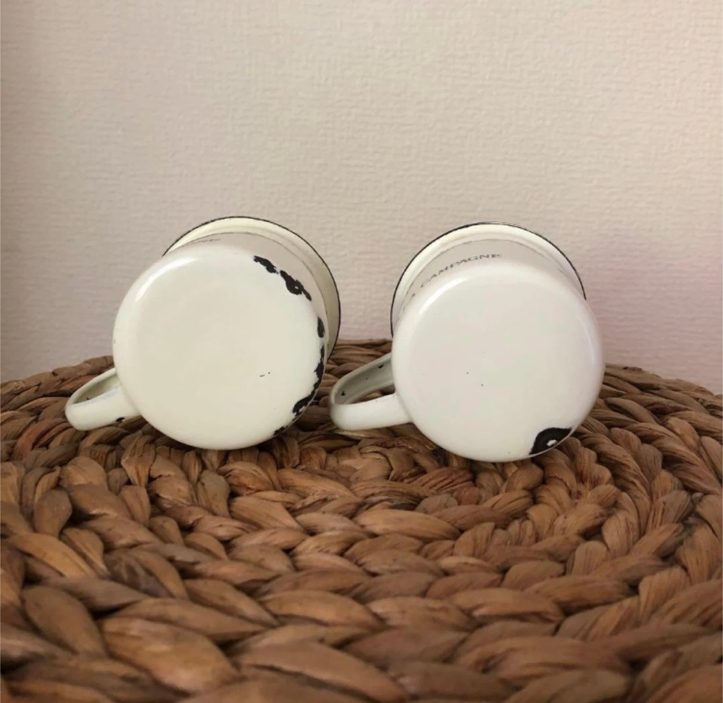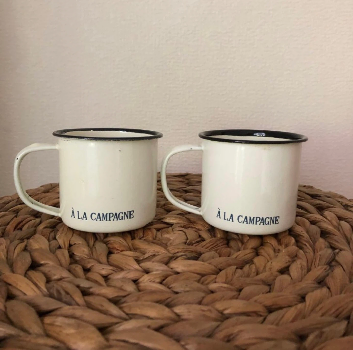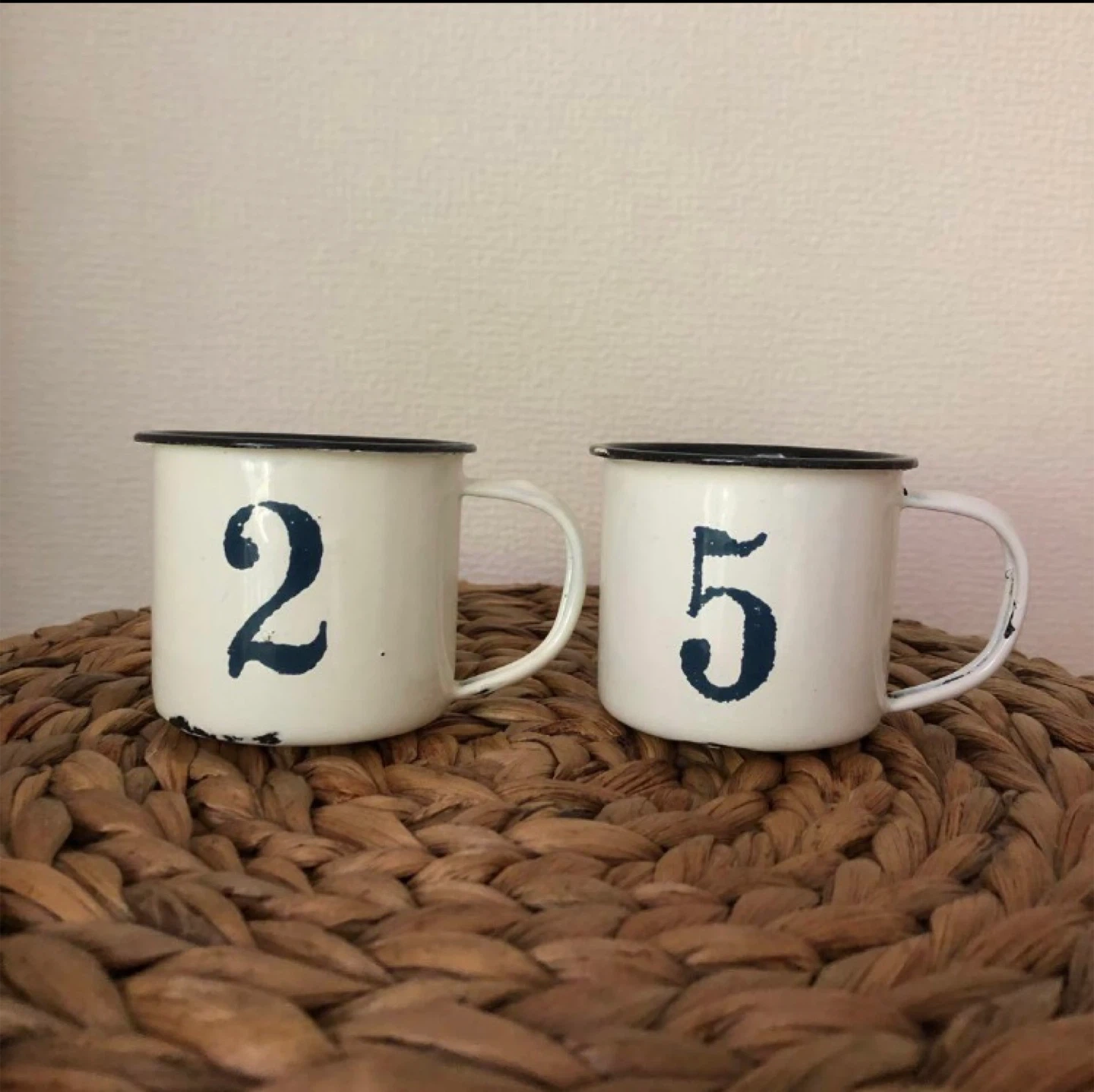ナンバー付きのホーローマグカップです - デザイン: ナンバー付き(2と5) - テキスト: À LA CAMPAGNE - 色: ホワイトとネイビー - 素材: ホーロー - 形状: マグカップ -サイズ 各 約6 x 9 x 7 (cm) 丁寧に洗って大切に保管していたので、汚れはありませんが、ホーロー本来の風合いというのか傷というのかが主観になっちゃうので念のため「やや傷や汚れあり」としています カップそのものはとてもかわいいので、ホーローの表面を「傷」ではなく「味わい」として使ってくださる方に出会えたら幸いです