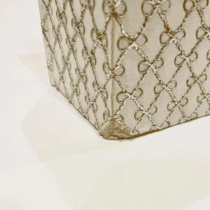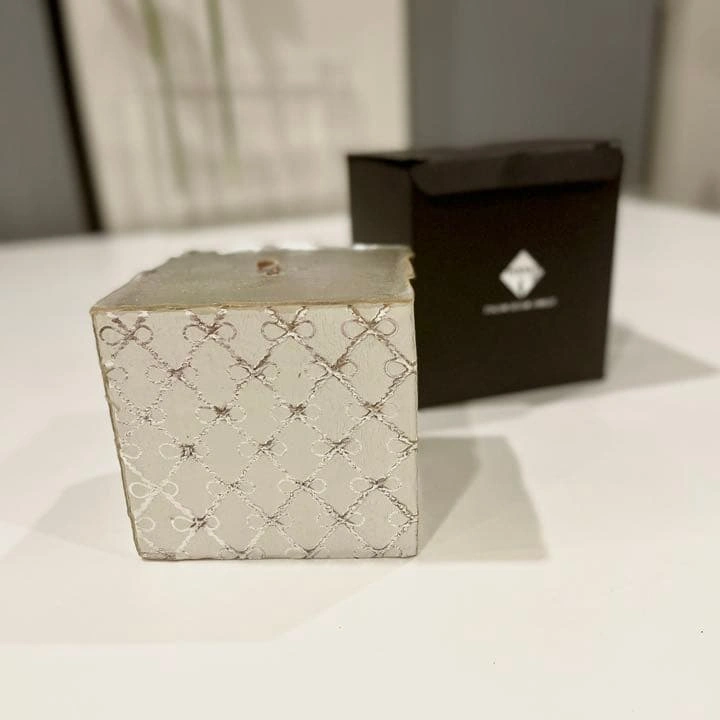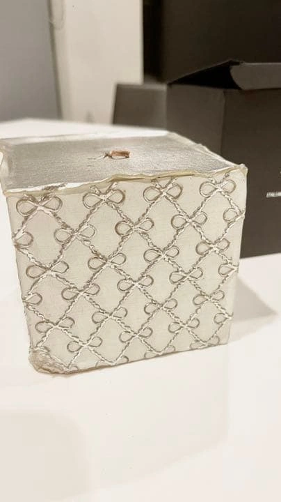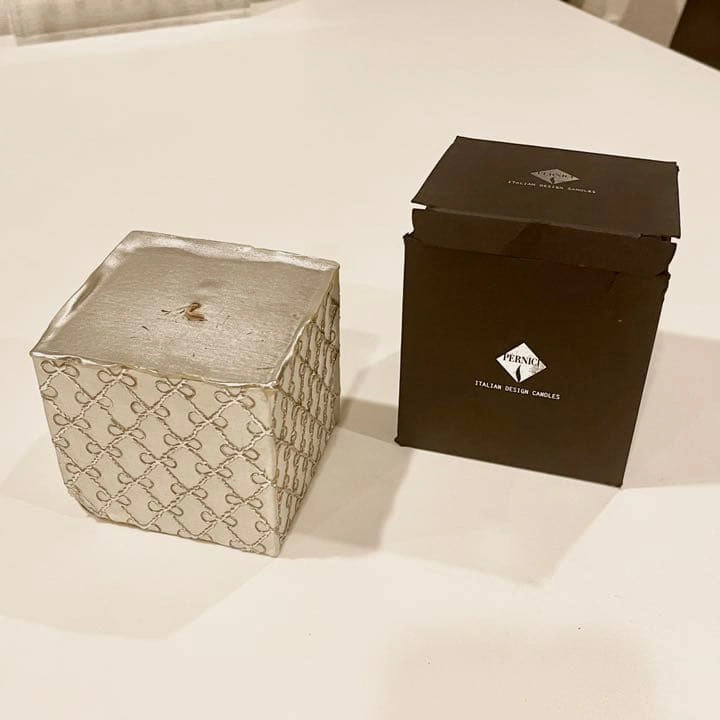 リボン模様のキャンドルです。 デコレーションとして飾っても良いと思います。 イタリアPernici社のハンドメイドのキャンドルです。 新品なのですが、床に落としてしまった為、一箇所、角が潰れてしまっています。3枚目の写真でご確認下さい。 サイズ φ10xH14cm カラー···シルバー ご希望の方はお気軽にご連絡ください。