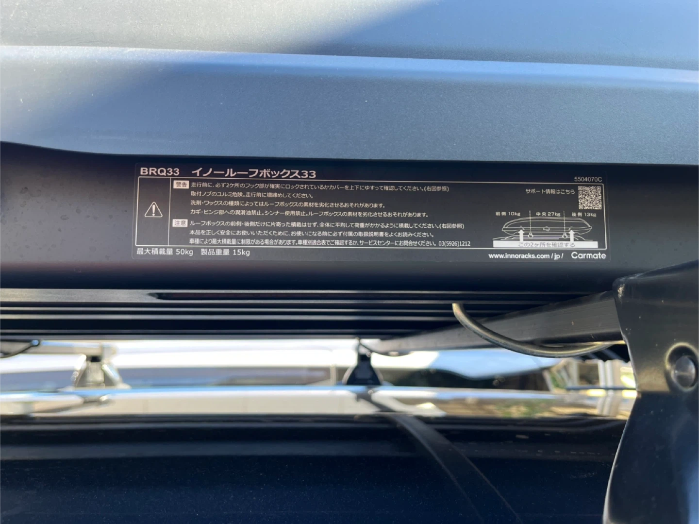 イノーのルーフボックスです。 【情報】 ブランド:イノー(INNO) 型番:BRQ33 最大積載量:50kg 製品重量:15kg フリードに載せて使用していましたが、乗り換えの為お譲りいたします。 ほとんど中身を入れて使用することがなかったので、比較的綺麗だと思います。 自宅への引き取り限定(着払いでよければ対応いたします)でお願いいたします。 年末年始の帰省などにいかがでしょうか? 他のサイトでも出品の為、購入の際はコメントいただけると助かります。