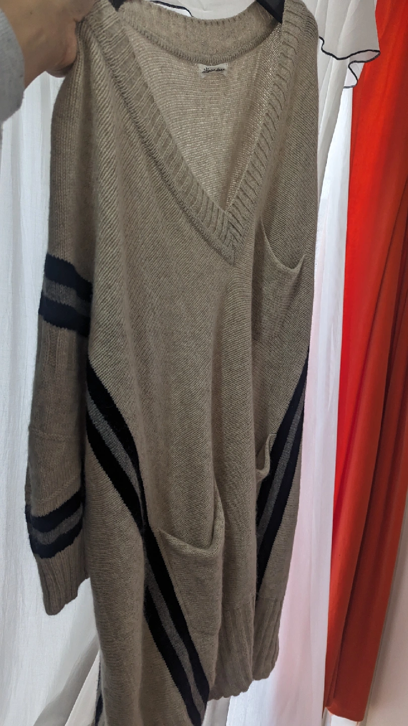 イリアンローヴのVネックニットです。 イリアンローブiliann loeb ヤク100% カシミヤよりも高級で、カシミヤよりも暖かい上質ヤクウール100%です Vネックデザインのベージュニット、ストライプとポケ ット付きで大人カジュアルなスタイルに最適。 - 色: ベージュ - デザイン: Vネック、ストライプ入り - ポケット: 前面にポケットあり 着丈:101 身幅:70 ・カラー:ベージュ ・デザイン:ストライプ ・サイズ:LOT.194-159 ・使用感少なめ ご不明点があればお気軽にご連絡ください