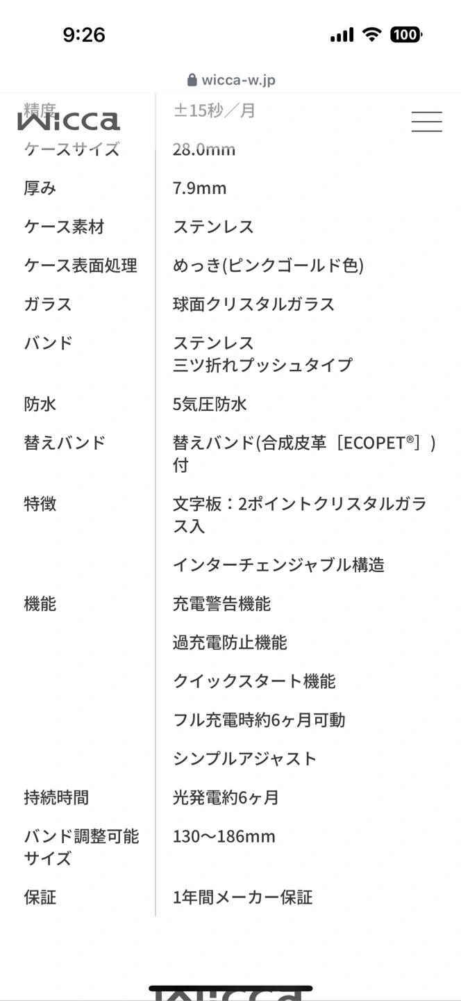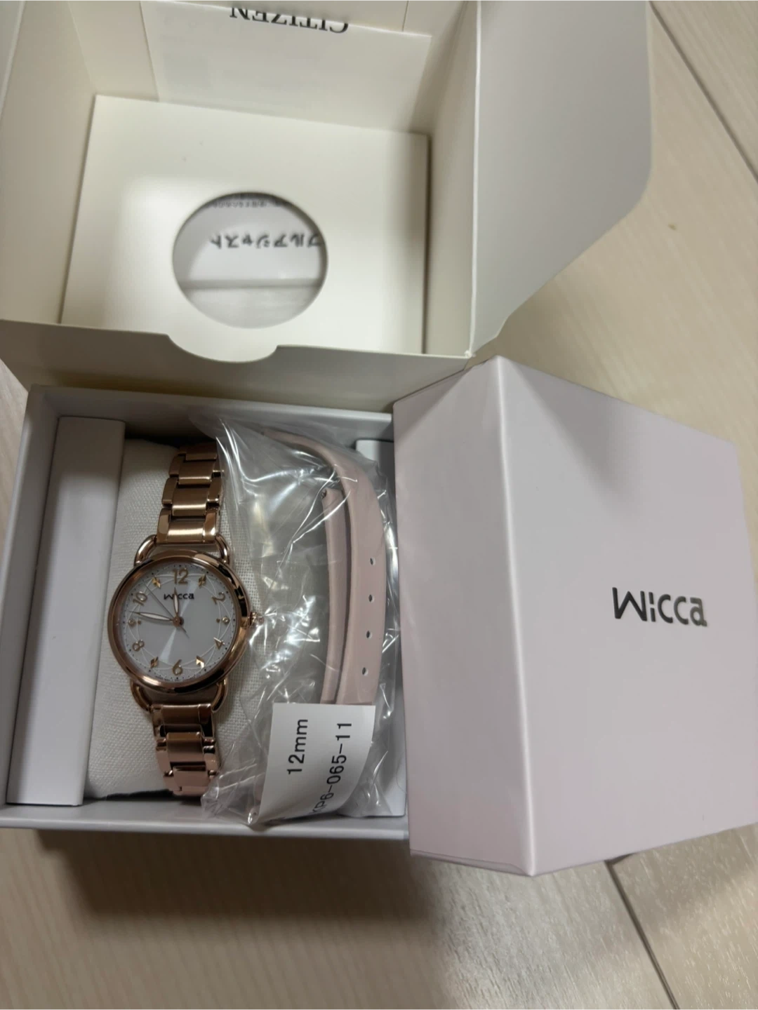 ウィッカの腕時計です。 シチズン そのままプレゼントもできます。 「メイクアップ」をテーマにした、やわらかなシルエットとパイプのようなラグ(ケース本体とバンドをつなぐ部分)が特徴的なモデル。メイクをしているときの高揚感やメイクアップアイテムからインスピレーションを得たデザインで、「腕時計を着けることで気分が上がり、1日のスタートが楽しくなりますように」という想いを込めています。文字板にはフェイスパウダーをイメージしたパターンを描き、3時と9時位置のクリスタルガラスでアイシャドウの光を表現しました。 温かみのあるチークのようなピンクベージュの替えバンドをセットした、その日のメイクやフ アッションに合わせて印象を変えられる2way 仕様です。バンドは、ユーザーご自身で手軽に付け外しがで きるインターチェンジャブル構造を採用しています。