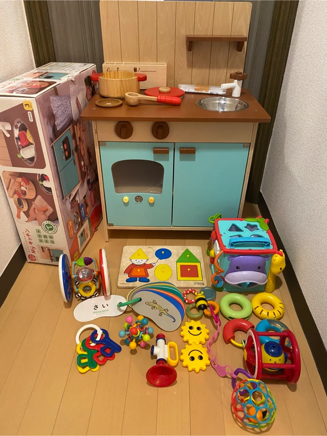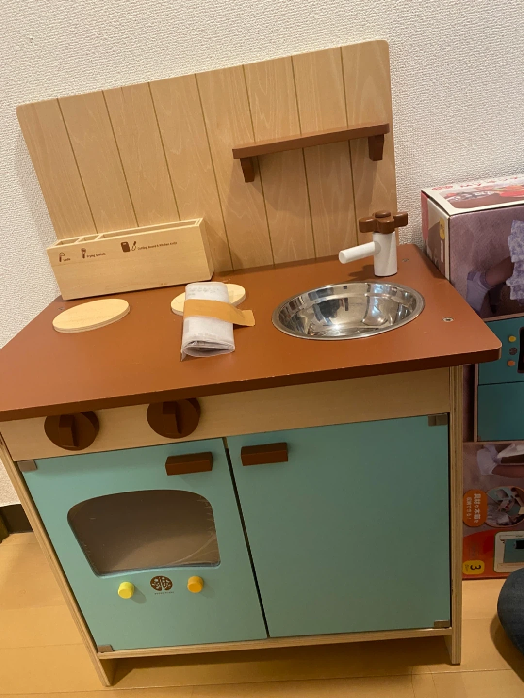 WoodyPuddy はじめてのおままごとMYキッチン 生産終了品となります。 (おまけ付き) 1枚目のお写真の全てを纏めてお譲りさせて頂きます。 【情報】 ブランド:ウッディプッディ 商品:マイキッチン 【状態】 全体的に綺麗ですが、 写真2枚目の所にだけ傷がございます。 窓のビニールはまだ剥がしておらず綺麗です。 (写真3枚目参照) 【付属品】 1枚目の写真に写っているものが全てです。 説明書、箱あり 【定価】 ¥24,75(税込) 中古品であることご了承ください