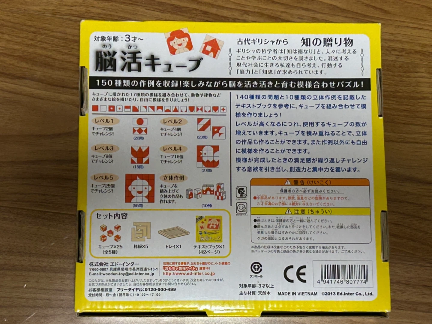 エド・インターの脳活キューブです。 ・対象年齢:3〜99歳 ・140問+10問の立体作例テキスト付き ・模様を組み合わせて絵を描く 中古品であることをご了承ください。