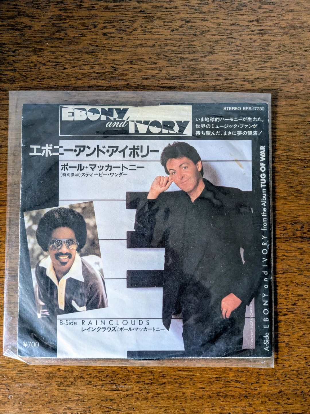 ポールマッカートニー&スティービーワンダーの、エボニー・アンド・アイボリーのEPレコードです。 1980年代発売のもので、経年劣化のため、紙ジャケットに破れがあります。 盤面は傷などなくきれいです。 日本語の解説紙つき。 中古品であることご了承ください