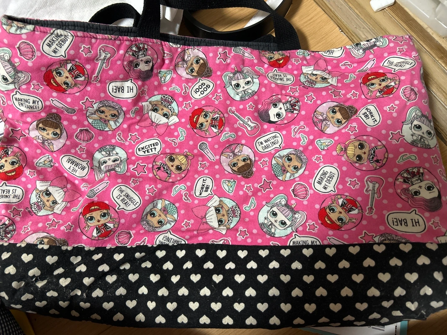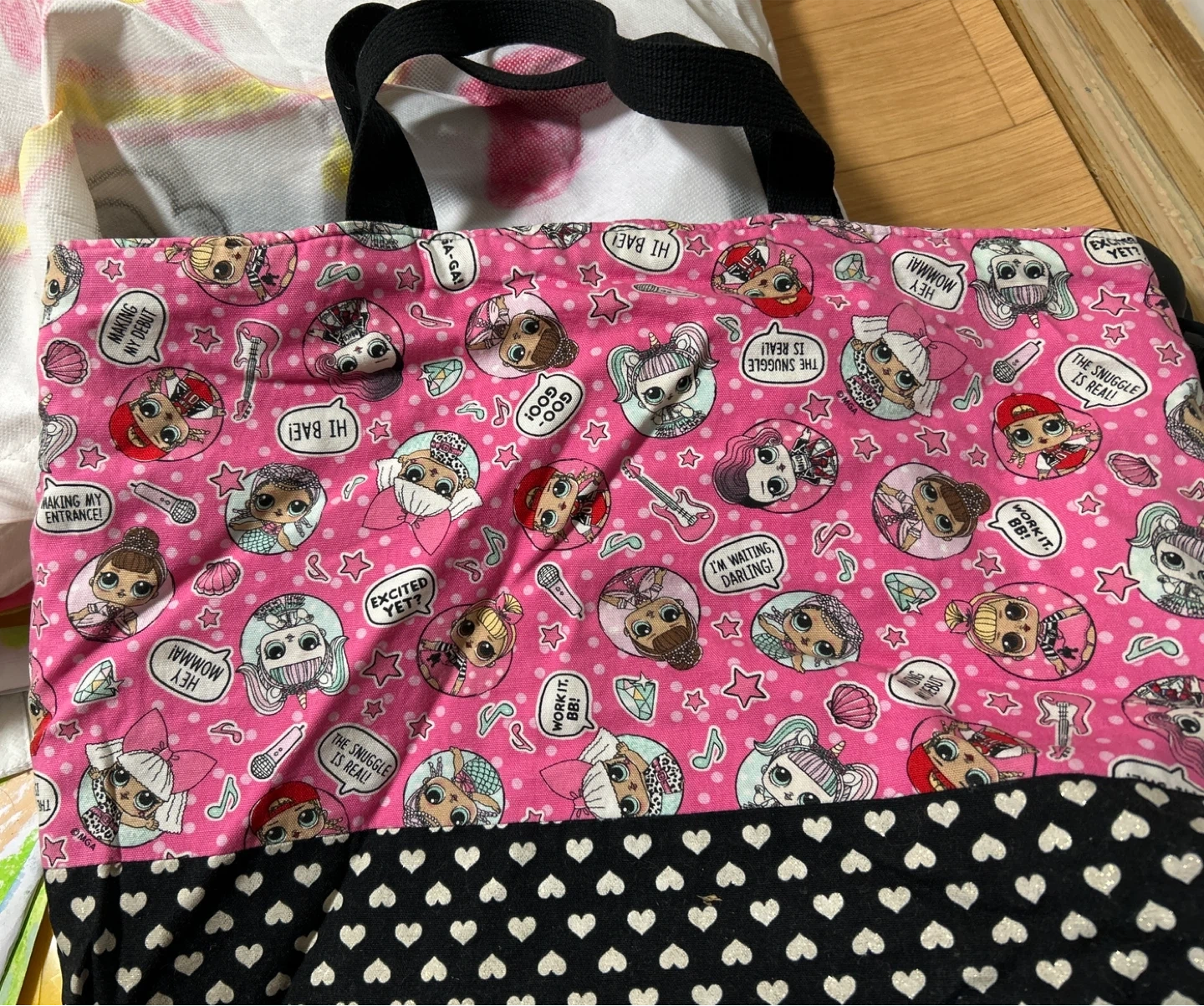 エルオーエルのトートバッグです。小学生向けです。一回洗ってから渡します。 ・色:ピンク、黒 ・デザイン:エルオーエルサプライズ柄、ハート柄 ・使用感:少々あり 中古品であることご了承ください
