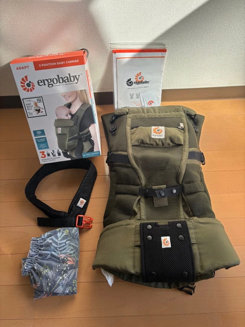 小さめの女児、1人だけに使用。 0才2800g〜2才半10kgまで使用 - ブランド: ergobaby - モデル名: Adapt - 色: カーキ - 機能: 3ポジションベビーキャリア - 付属品: 箱付き - デザイン: メッシュ素材 - 特徴: 調整可能なストラップ - ポケット: フロントポケットあり メッシュ素材で、調整可能なストラップとフロントポケット付きの抱っこ紐です。 日本限定カラーのオリーブグリーンカラーです。男性にも◯ 赤ちゃんの落下防止用のベビーウエストベルト(こちらも日本限定) ストラップを止めるゴムが数箇所伸びています写真(5〜6枚目)をご覧ください。 説明書付き 手作りカバー付き 対面抱き おんぶ 腰抱き ご希望の方はお気軽にご連絡ください。