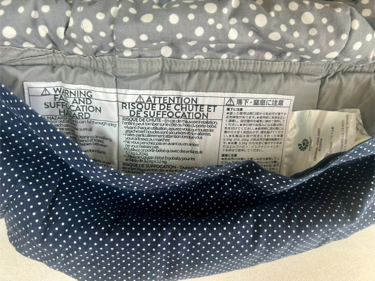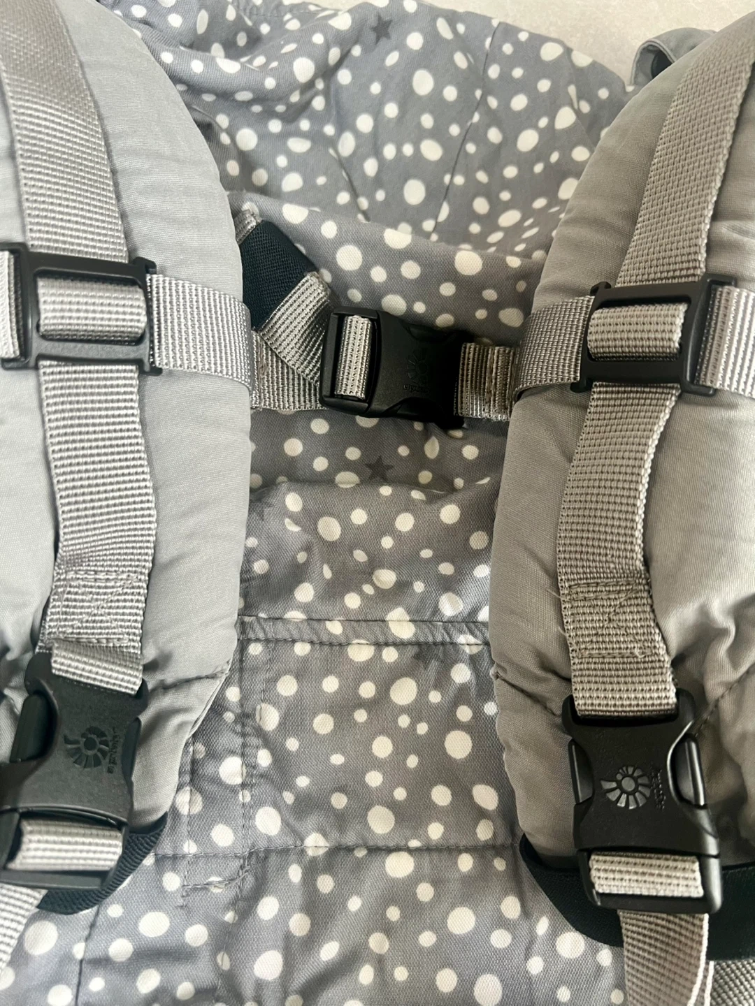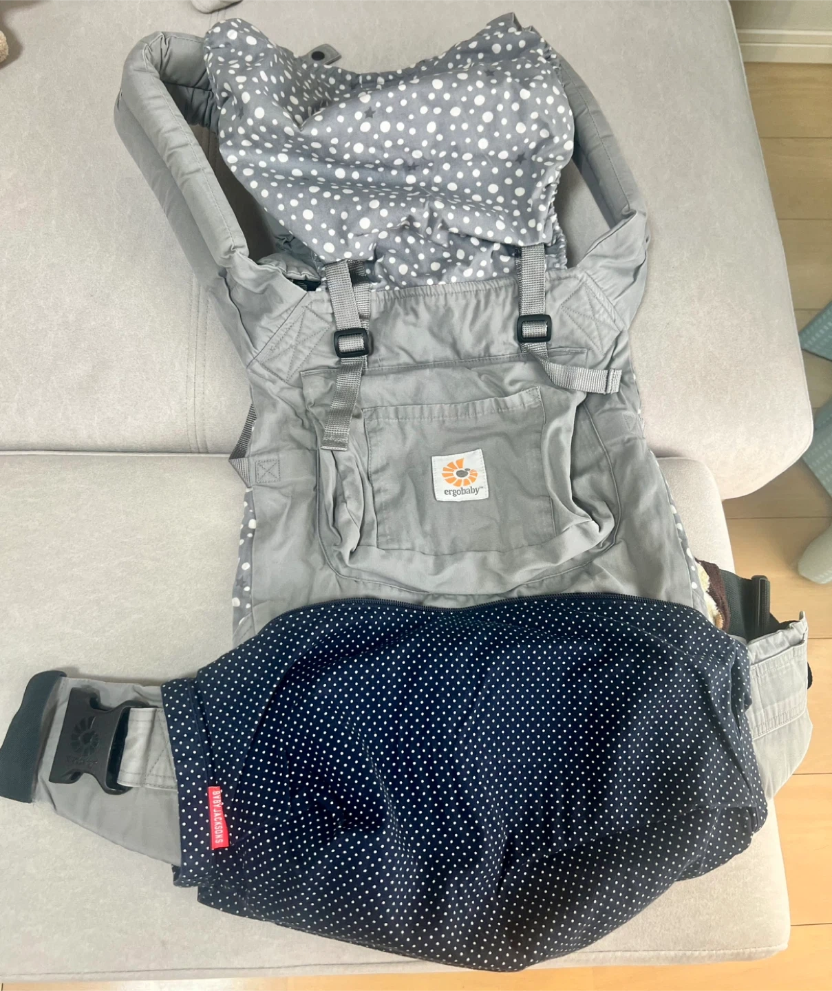 クールマックス素材のグレー・ドット柄抱っこひもです。 アカチャンホンポ限定モデル。 グレーにドット柄なので私服にも合わせやすいです。 バックルの痛みなどはありません。 丸めて保管できるカバー付き。 他の抱っこ紐と併用して使っていたので大きなダメージはなく、洗濯して保管していました。 一度は人の手に渡ったものですので、神経質な方はご遠慮下さい。 たたんで箱に直しておりますので、たたみジワございます。ご了承下さい。 - ブランド: ergobaby - モデル名: 3 Position Baby Carrier - 対象年齢: Baby to Toddler (12-45lbs / 5.5-20kg) - 色: グレー・ドット柄 - 特徴: クールマックス素材使用 生後4ヶ月〜 平日は12-13時/18時〜、週末は日によって受け渡し可能時間が異なるので都度ご相談させてください。