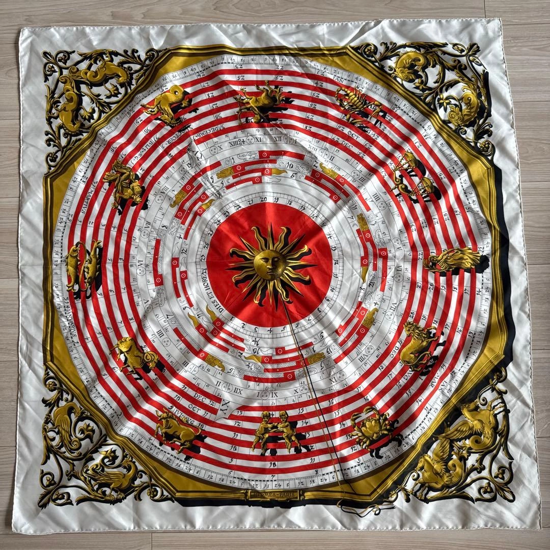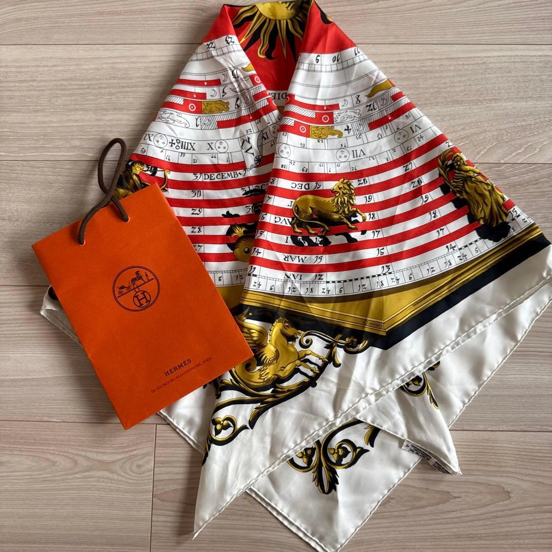 エルメス正規品 カレ90 占星術 DIES ET HORE 素材 シルク100 付属品 紙袋 少しシワあり カラー オフホワイト 赤 ライトブラウン 黒 イエローブラウン サイズ 89×89 大手ブランド買取販売店で鑑定済みのものを購入。 状態:未使用品を購入しそのまま保管していました。 保管シワがあります。 元々ですがスカーフの手縫いの際に発生しているパッカリングのような糸ツレが外回りに大小あります。 近くて見るとわかる範囲の小さな薄い汚れが少しあります。 その他糸ツレや汚れなどダメージは無く生地の艶ももありとても綺麗な状態です。 元々張りは少なく柔らかめのシルクだと思います。 オフホワイトと赤の曲線が爽やかで今の季節ビーチやリゾートにぴったりなスカーフです。衿元は勿論バックに結んだり冷房対策にもおすすめです。 細部まで検品していますがどうしても見落としなどもあると思いますので画像と説明ご確認の上ご購入よろしくお願いいたします。 ご覧いただきありがとうございます。 カラー···ホワイト系