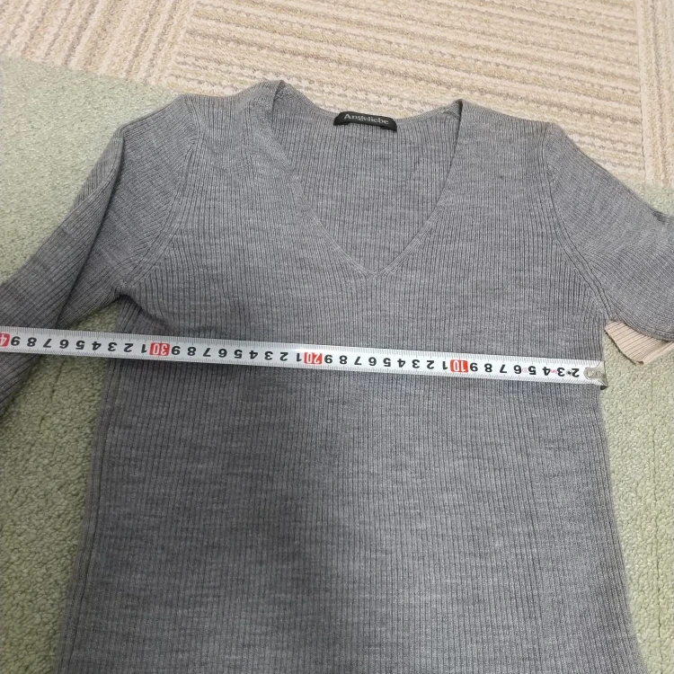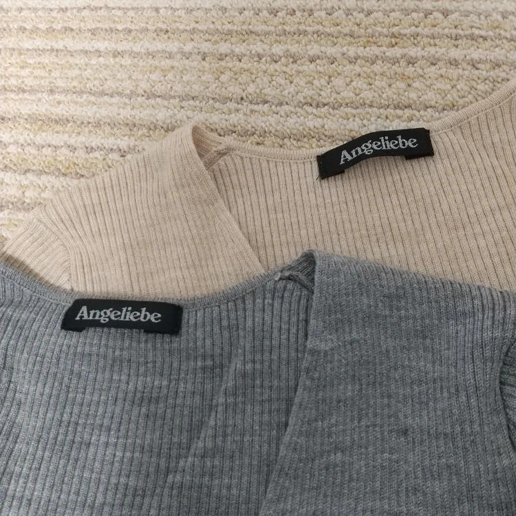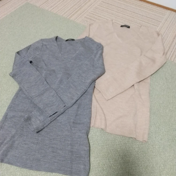 マタニティブランド、エンジェリーベのVネックリブセーターです。 グレーとベージュのセット お腹を隠すゆったり系ではなく、フィットするタイプ。 着丈が長めで、かなり伸縮性があり、大きくなったお腹を包み込んでくれます 。 妊娠中でもスーツを着ていたので、冬場にジャケットの下に着るのに良かったです。(チュニックのようなゆったりしたマタニティはスーツに合わず…) また、少し丈が長いだけなので、出産後も普通に着られます!(私はもともと丈長めが好きなので、産後も着ていました。) 洗濯機で洗っていましたが、毛玉もほとんどできず、キレイです。(6枚目の写真はシミではなく、 もともとこれくらいの色むらがところどころあります。) どなたかぜひ!