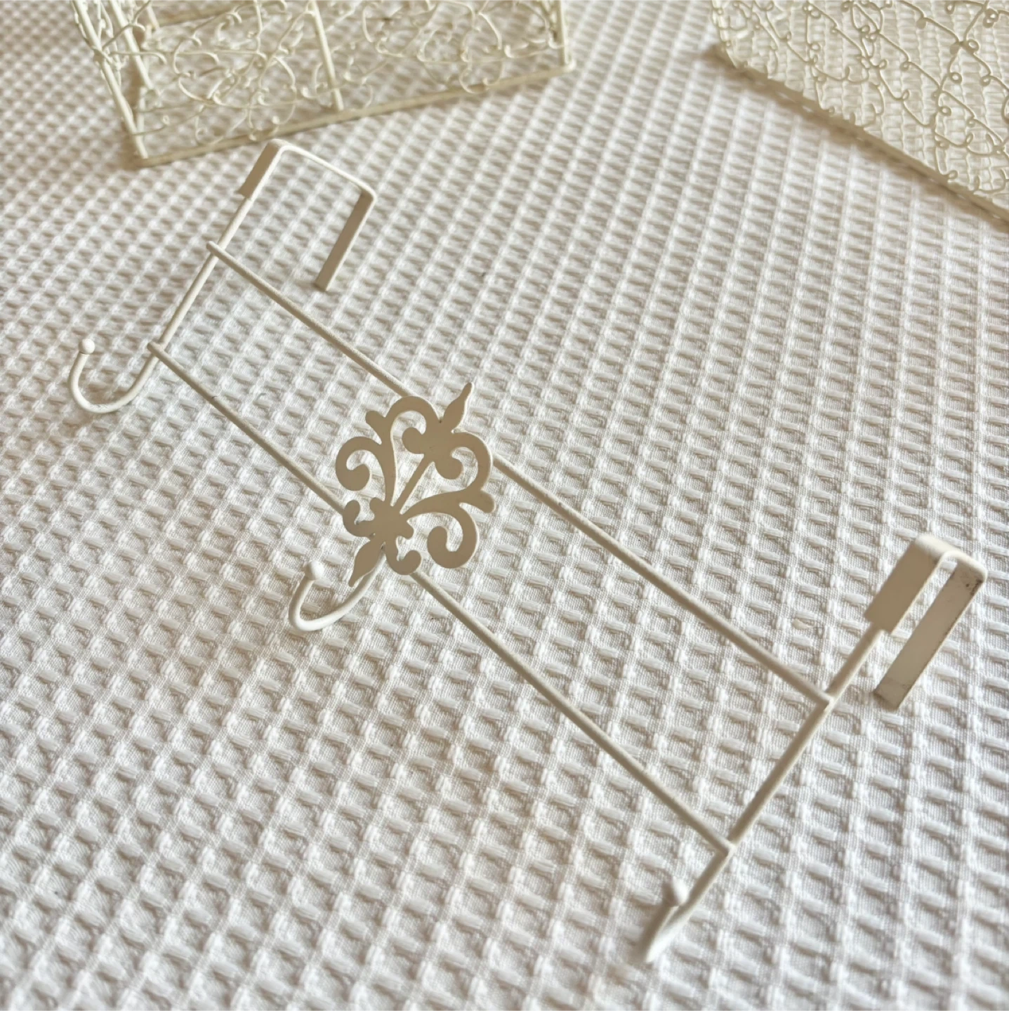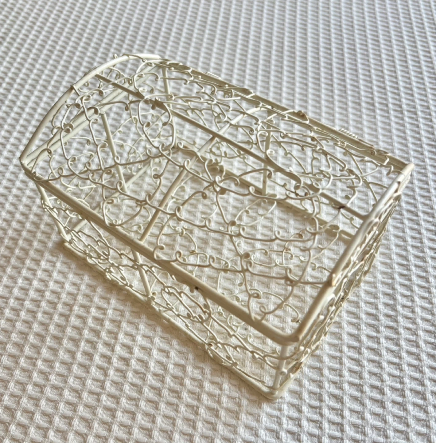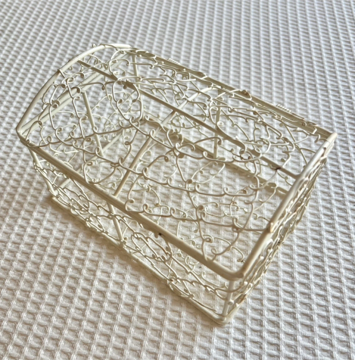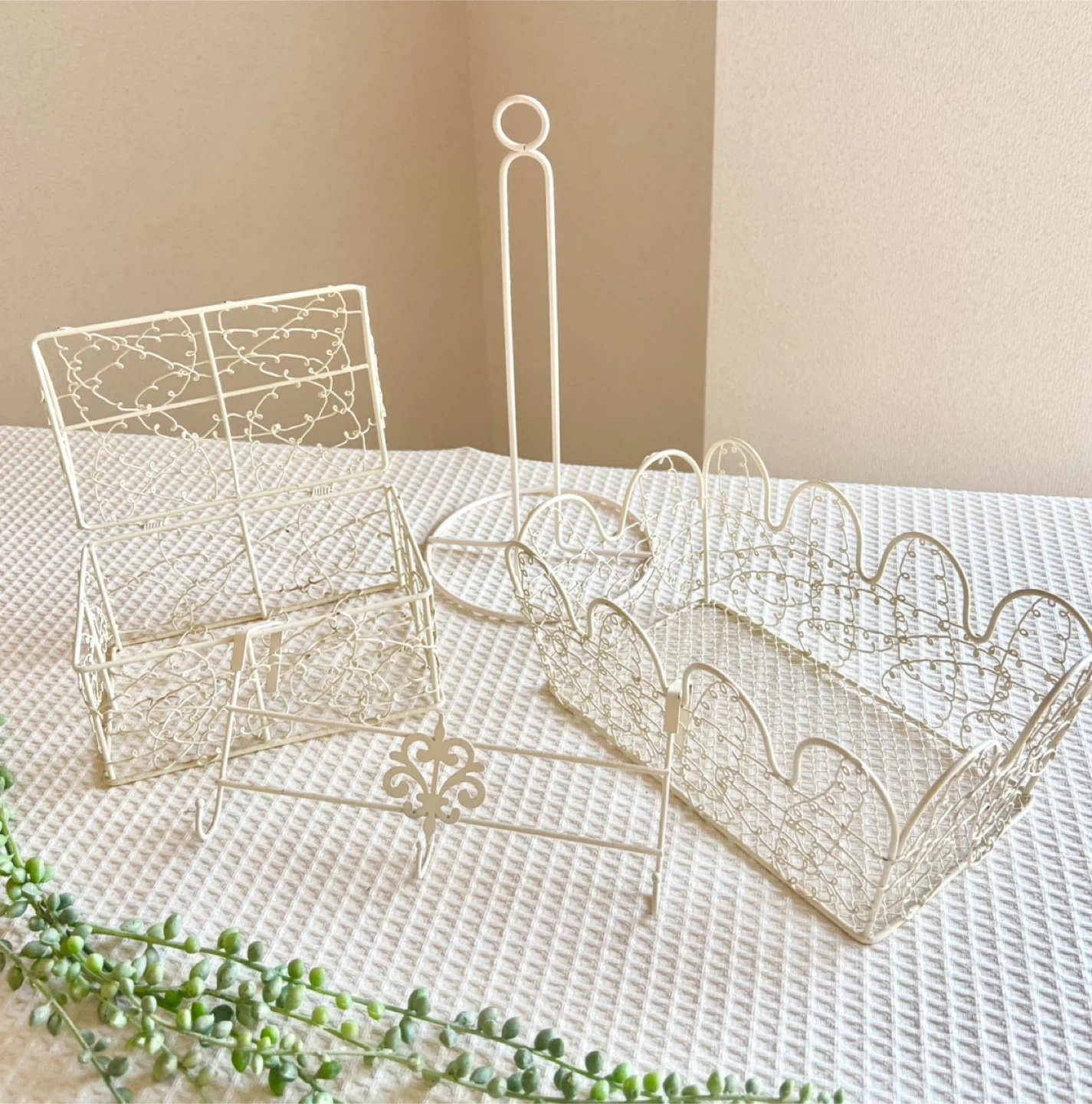 オフホワイトの金属製ワイヤーバスケット、蓋付きバスケットと、フック、ペーパースタンドの4点セットになります。 アンティーク風なインテリア、フレンチカントリー風なディスプレイ、ガーデニングなどにいかがでしょうか? いずれも自宅保管品、中古品になります。ご理解ある方にお譲りいたします。 少々、キズ、ハゲ、サビが見られます。 ⚫︎蓋付きバスケット 高さ 約9センチぐらい 16.5×11.5センチぐらい ⚫︎バスケット 高さ 約10センチぐらい 24×14.5センチぐらい ⚫︎フック 横幅 20.5センチぐらい ⚫︎ペーパースタンド 高さ 約28センチぐらい 底直径 約14センチぐらい ※いずれも一番大きな部分です。素人採寸 ご覧いただきありがとうございます。 #アンティーク #フレンチカントリー #カントリー #シャビー #インテリア #ワイヤー雑貨 #ガーデニング #白 #オフホワイト #雑貨