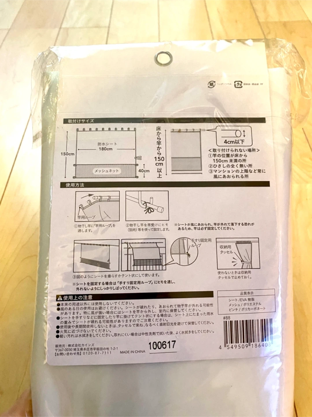 カインズのベランダカーテンです。 ・ベランダカーテン ・雨よけになる防水シート ・風通しの良いメッシュ素材 ・ずれ止めピンチ2個付き ・未使用時は畳んで収納可能 ・取り付け可能サイズ:竿から手すりまで4cm以下、手すりから床まで150cm以上、メッシュネット部分40cm ・商品状態:未使用・室内保管 中古品であるということをご了承の上、ご購入ください。 ご不明点等ございましたらご連絡ください。