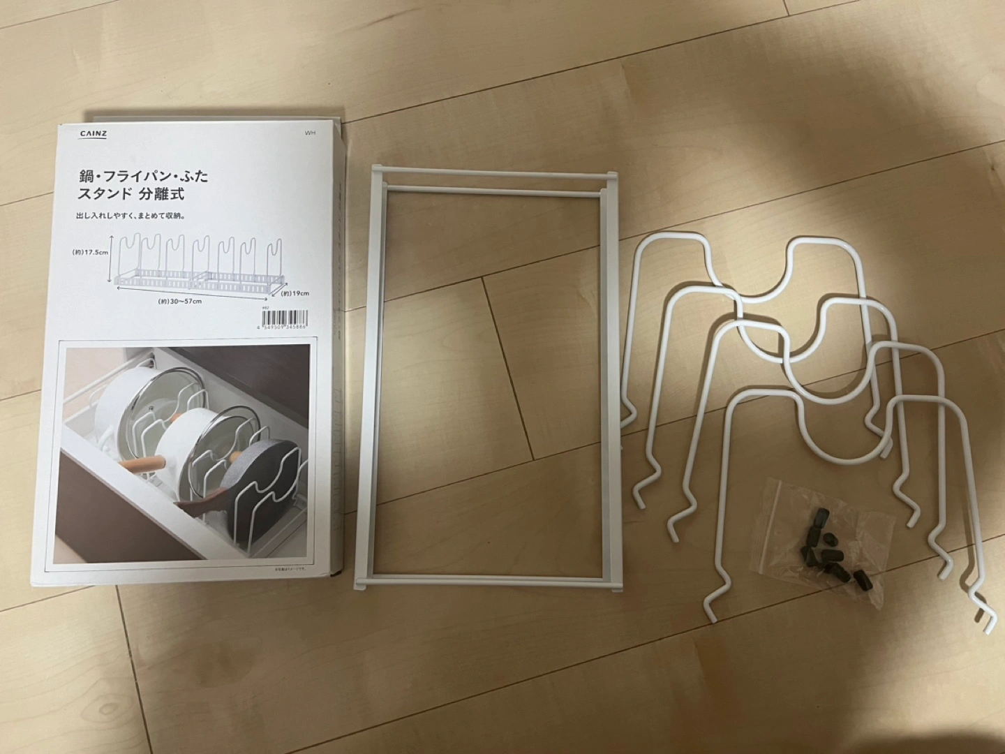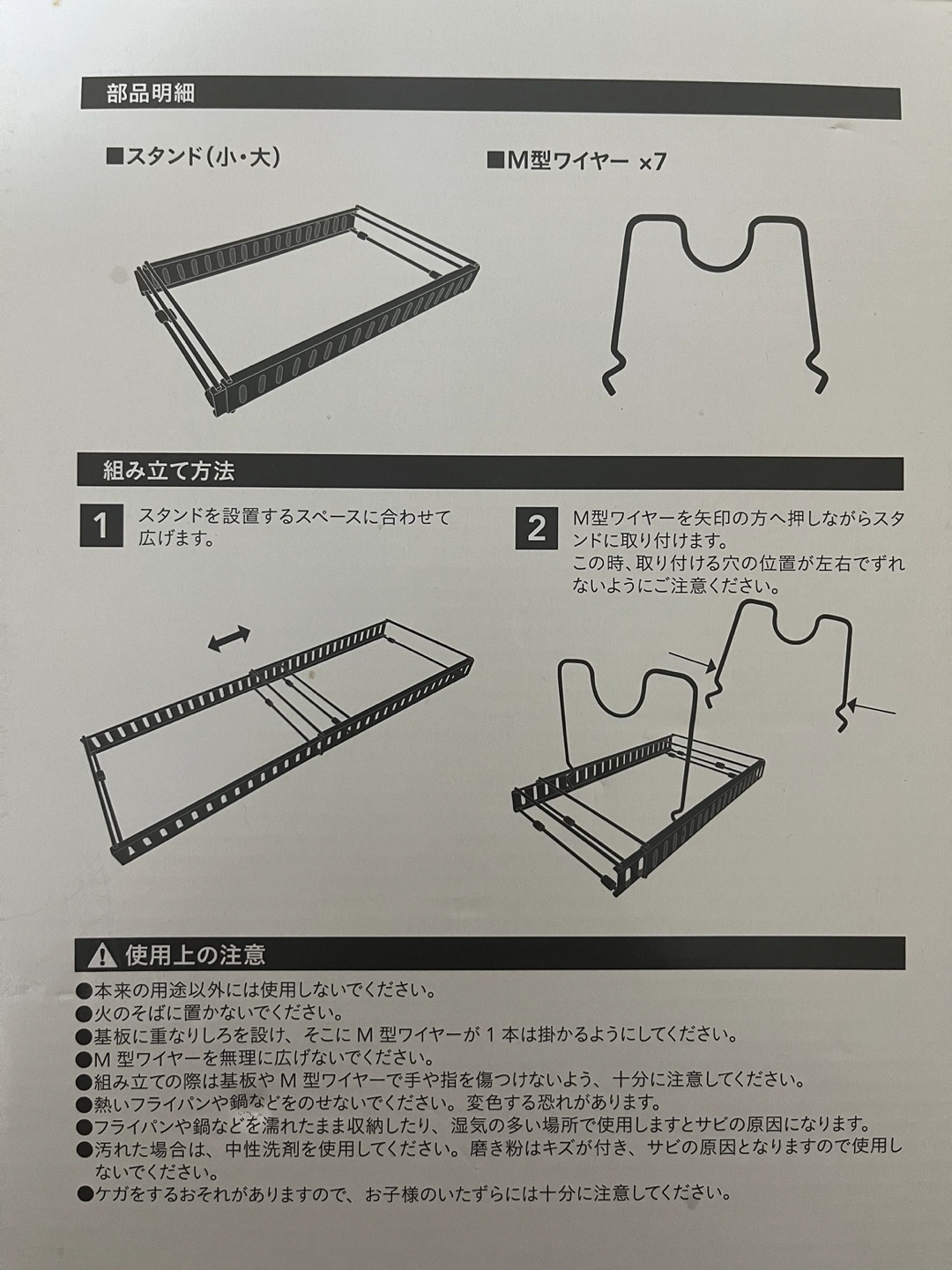 本来であればスタンドが2つ、ワイヤーが7つあるところ、お写真の通り、スタンド(高さ17.5cm×幅30cm×奥行き19cm)は1つ、ワイヤーは4つのみとなります。滑り止めは8つございます。 立てかけるアイテムの幅によって間隔の調整が可能で、とても便利です。 目立った傷や汚れはございませんが、中古品であることをご了承の上でご購入ください。 定価:1,480円
