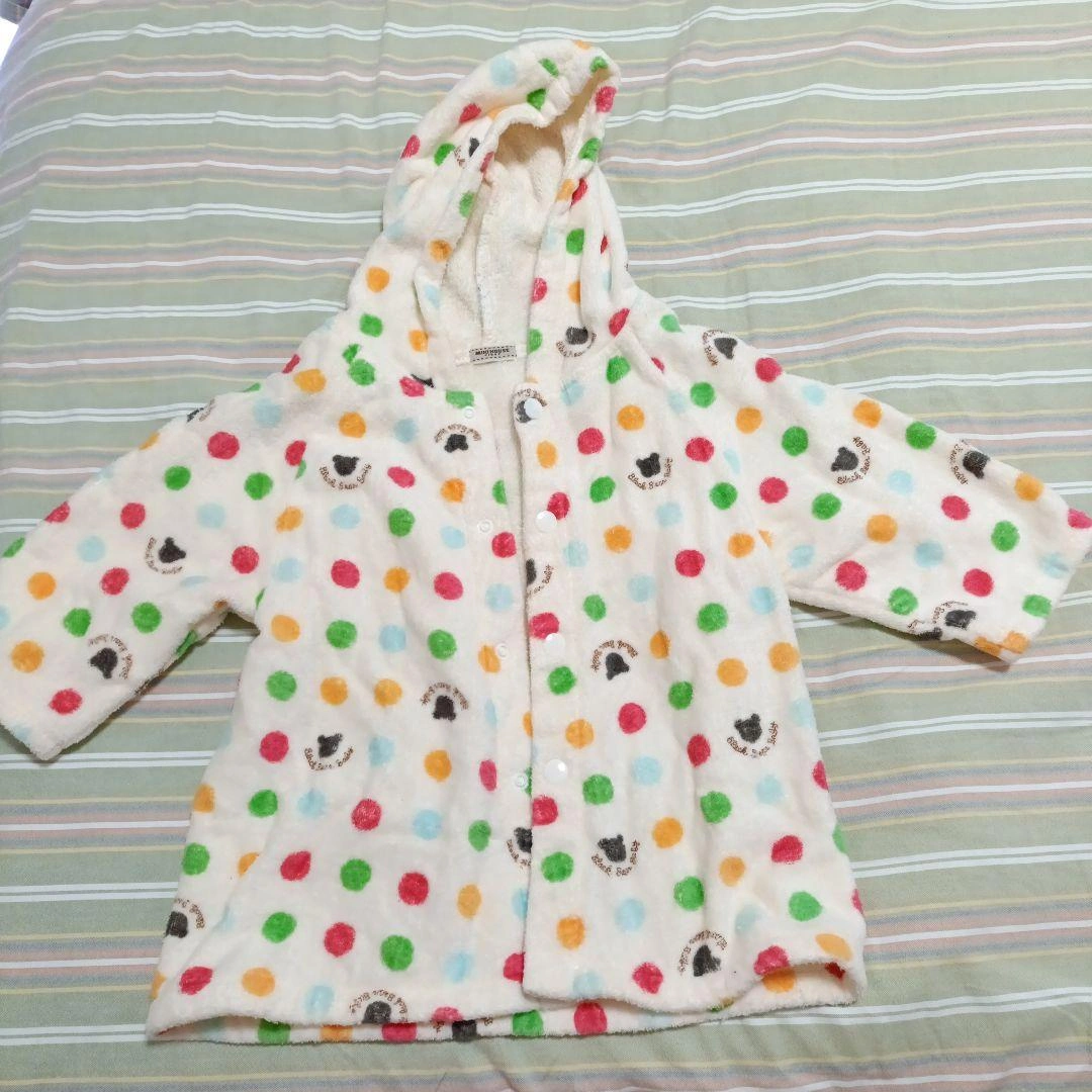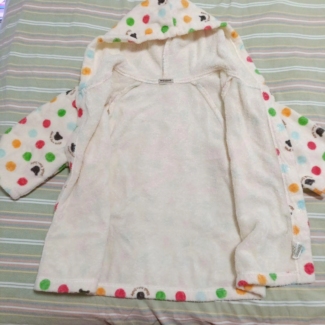 カラフルな水玉模様のフード付きパジャマです。柔らかいタオル地で快適にお使いいただけます。 - デザイン: カラフルな水玉模様 - フード: フード付き - 素材: 柔らかいタオル地 - サイズ: 100cm ご覧いただきありがとうございます。 ご希望の方はお気軽にご連絡ください。